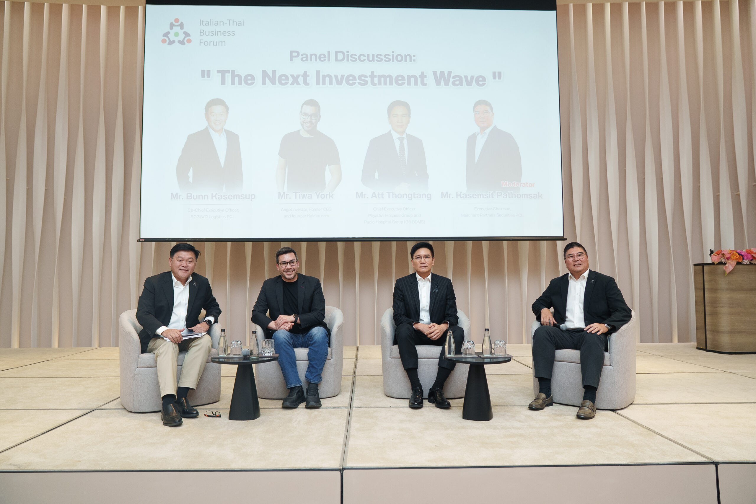 จากนั้นเป็นการเสวนาในหัวข้อ “The Next Investment Wave” โดยผู้เชี่ยวชาญจากองค์กรชั้นนำ ได้แก่ นายบรรณ เกษมทรัพย์ ประธานเจ้าหน้าที่บริหารร่วม บริษัท เอสซีจี เจดับเบิ้ลยูดี โลจิสติกส์ จำกัด (มหาชน) หรือ SCGJWD (SCGJWD Logistics Public Company Limited) นายทิวา ยอร์ค ประธานเจ้าหน้าที่บริหาร Kaidee (ขายดี) แพลตฟอร์มซื้อขายสินค้าออนไลน์ชั้นนำของประเทศไทย นายอัฐ ทองแตง ประธานเจ้าหน้าที่บริหารเครือโรงพยาบาลพญาไท-เปาโล (Phyathai Hospital Group and Paolo Hospital Group (G5 BDMS)) โดยมี นายเกษมสิทธิ์ ปฐมศักดิ์ ประธานกรรมการบริหาร บริษัท หลักทรัพย์จัดการกองทุน เมอร์ชั่น พาร์ทเนอร์ จำกัด (Merchant Partners Asset Management) ทำหน้าที่ผู้ดำเนินรายการ การเสวนาครั้งนี้ได้กล่าวถึง “คลื่นการลงทุนระลอกใหม่ กำลังเกิดขึ้นในหลายอุตสาหกรรมภายใต้บริบท 4Ds ได้แก่ Deglobalization, Decarbonization, Digitalization และ Demographics เช่น ภาคสุขภาพและเวลเนสกำลังขยับสู่การป้องกันและการดูแลสุขภาพเชิงรุก พร้อมการเติบโตของ Telemedicine ขณะที่ภาคโลจิสติกส์ต้องเร่งยกระดับประสิทธิภาพ ปรับจากระบบ Just-in-Time ส่งมอบสินค้าทันทีเพื่อลดปริมาณสินค้าคงคลัง ไปสู่ระบบ Just-in-case ให้มีสินค้าสำรองเพิ่มขึ้นสำหรับรองรับเหตุการณ์ที่ไม่แน่นอน รวมทั้งการนำเทคโนโลยี AI และระบบอัตโนมัติมาใช้เพื่อรองรับการเป็นศูนย์กลางกระจายสินค้าในอาเซียน”