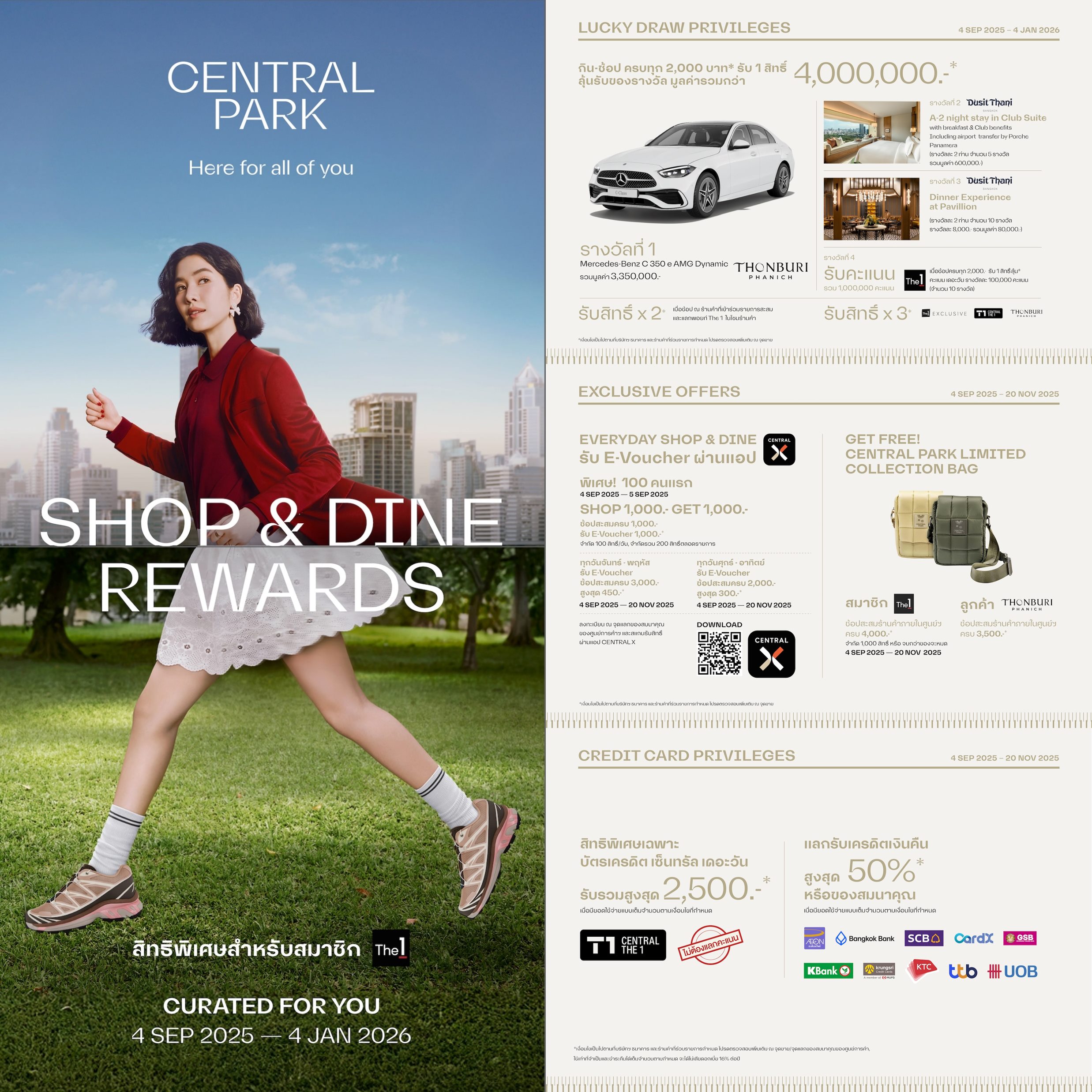 4 ก.ย. 68 ฉลองเปิดศูนย์การค้าเซ็นทรัล พาร์ค #HereForAllOfYou จัดเต็มโปรโมชันสุดเอ็กซ์คลูซีฟ 🎉 Shop & Dine Rewards Curated For You ด้วย สิทธิพิเศษสำหรับสมาชิก The 1 เตรียมลุ้น Lucky Draw Privileges กิน-ช้อป ครบทุก 2,000 บาท รับ 1 สิทธิ์ลุ้น รางวัลมูลค่ากว่า 4,000,000 บาท* ตั้งแต่ 4 ก.ย. 68 – 4 ม.ค. 69 รางวัลที่ 1 Mercedes-Benz C 350 e AMG Dynamic รวมมูลค่า 3,350,000 บาท จาก Thonburi Phanich รางวัลที่ 2 บัตรกำนัลห้องพัก Club Suite 3 วัน 2 คืน พร้อมอาหารเช้า รวมถึง Club benefits และรถรับ-ส่งสนามบินโดย Porche Panamera จากดุสิตธานี กรุงเทพฯ รางวัลละ 2 ท่าน จำนวน 5 รางวัล รวมมูลค่า 600,000 บาท รางวัลที่ 3 ประสบการณ์ดินเนอร์ที่ Pavillion ที่ดุสิตธานี กรุงเทพฯ รางวัลละ 2 ท่าน จำนวน 10 รางวัล รางวัลละ 8,000 บาท รวมมูลค่า 80,000 บาท รางวัลที่ 4 ช้อปครบทุก 2,000 บาท รับ 1 สิทธิ์ลุ้น* คะแนน เดอะวัน รางวัลละ 100,000 คะแนน จำนวน 10 รางวัล รวม 1,000,000 คะแนน และห้ามพลาด รับสิทธิ์ลุ้น x2* เมื่อช้อป ณ ร้านค้าที่เข้าร่วมรายการสะสมและแลกพอยท์ The1 ในโซนร้านค้า และ รับสิทธิ์ลุ้น x3* สำหรับสมาชิก The 1 Exclusive และสมาชิกบัตรเครดิต Central The 1 และลูกค้า Thonburi Phanich เป็นต้น พร้อมด้วย Exclusive offers อีกมากมาย