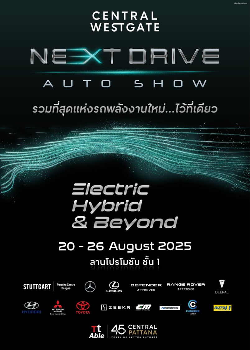 บริษัท เซ็นทรัลพัฒนา จำกัด (มหาชน) ผู้บริหารศูนย์การค้าเซ็นทรัล เวสต์เกต ร่วมกับ บริษัท ทีที เอเบิ้ล จำกัด จัดงาน “Next Drive Auto Show” ครั้งแรกกับมหกรรมแสดงยนตรกรรมพลังงานทางเลือกครบวงจร ทั้ง Electric, Hybrid, Plug-in Hybrid และพาหนะพลังงานใหม่ อาทิ E-Motorcycle, E-Bike, E-Scooter จากหลากหลายแบรนด์ดัง รวบรวมที่สุดแห่งเทคโนโลยียานยนต์สะอาดและนวัตกรรมแห่งอนาคตไว้ในที่เดียว ตอบโจทย์ไลฟ์สไตล์คนเมืองยุคใหม่ พร้อมเป็นเวทีแสดงศักยภาพอุตสาหกรรมยานยนต์ไทย และสร้างโอกาสเชื่อมโยงธุรกิจระหว่างผู้ผลิต ผู้ประกอบการ และผู้บริโภค ระหว่างวันที่ 20–26 สิงหาคม 2568 ณ ลานโปรโมชั่น ชั้น 1