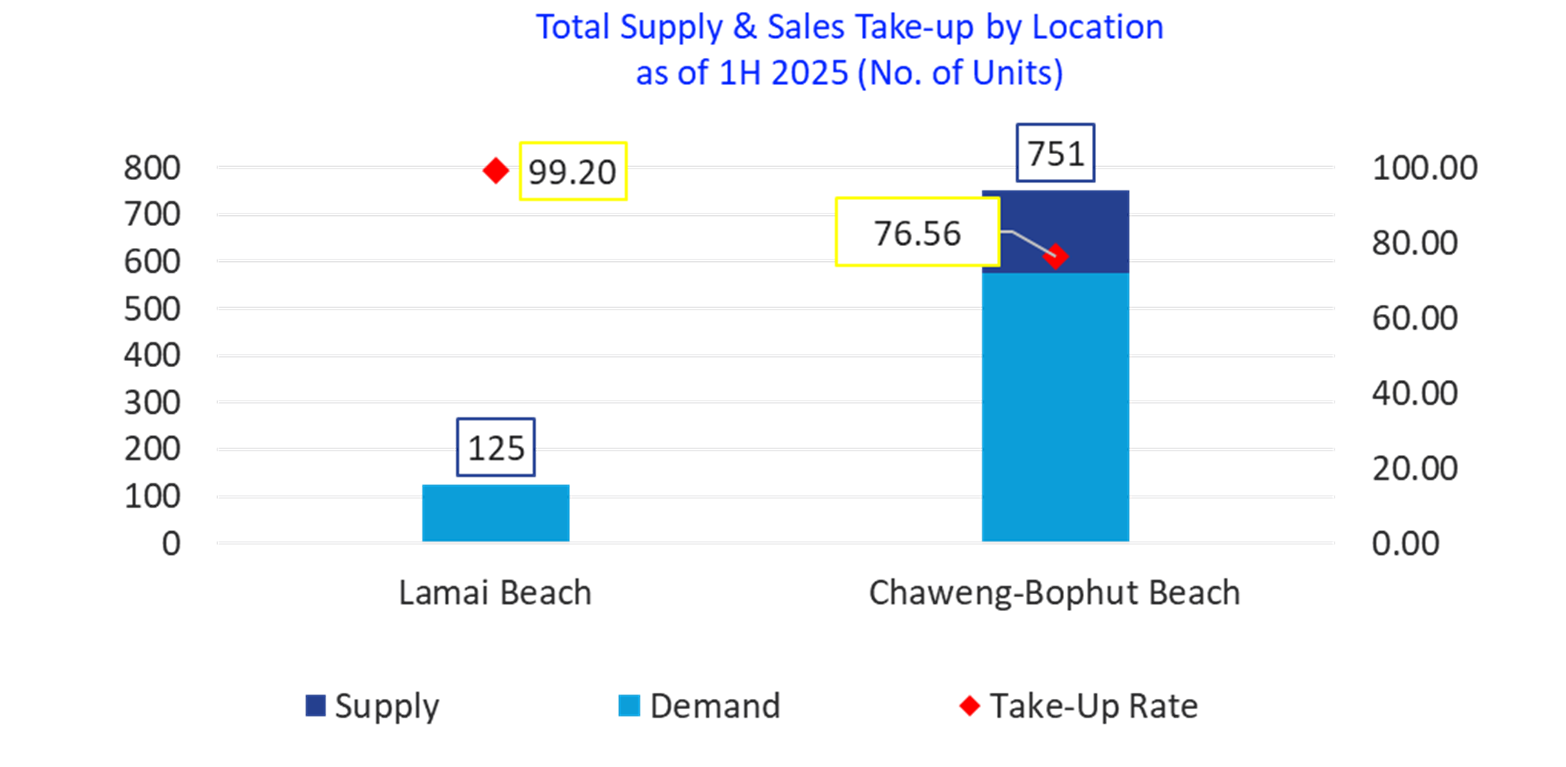 ณ ครึ่งแรกของปีพ.ศ. 2568 ภาพรวมตลาดคอนโดมิเนียมบนเกาะสมุยมีอุปทานรวมทั้งหมด 876 ยูนิต ขายแล้วทั้งหมดประมาณ 699 ยูนิต คิดเป็นร้อยละ 79.79% ของยูนิตทั้งหมด เหลือยูนิตรอการขายทั้งหมด 177 ยูนิต หรือคิดเป็น 20.21% ของอุปทานรวม ซึ่งอัตราการขายปรับตัวเพิ่มขึ้น 4.40% เมื่อเทียบกับครึ่งหลังของปีที่ผ่านมา โครงการคอนโดมิเนียมที่เปิดตัวล่าสุดได้รับความสนใจสูงจากทั้งผู้ซื้อไทยและต่างชาติ ส่งผลให้หลายโครงการมียอดขายสูง ฝ่ายวิจัยและการสื่อสาร คอลลิเออร์ส ประเทศไทยพบว่าหลายผู้พัฒนากำลังเตรียมเปิดเฟสเพิ่มเติมเพื่อตอบสนองความต้องการที่ยังคงแข็งแกร่งและจับกระแสตลาดที่เป็นบวก
