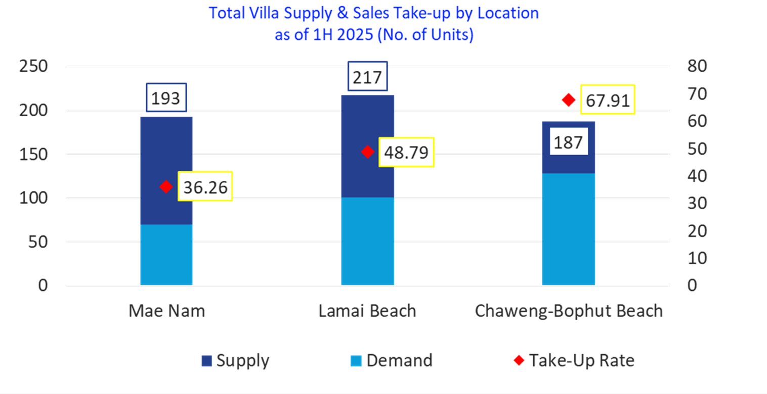 ฝ่ายวิจัยและการสื่อสาร คอลลิเออร์ส ประเทศไทย พบว่า เกาะสมุยยังคงเป็นจุดหมายปลายทางอันดับต้น ๆ สำหรับบ้านพักตากอากาศและการลงทุนอสังหาริมทรัพย์ระดับบน โดย ณ สิ้นครึ่งแรกของปี พ.ศ. 2568 พบว่า ตลาดบ้านพักตากอากาศในพื้นที่เกาะสมุยมีอุปทานที่อยู่ระหว่างการขายทั้งหมด 52 โครงการ รวม 597 ยูนิต มูลค่าการลงทุนรวมกว่า 14,800 ล้านบาท ซึ่งปรับตัวเพิ่มขึ้น 63.56% เมื่อเทียบกับครึ่งหลังของปีก่อน อุปทานส่วนใหญ่ตั้งอยู่ในพื้นที่ใกล้หาดสำคัญๆ ของเกาะ เช่น แม่น้ำ, หาดเฉวง–บ่อผุด และหาดละไม เป็นต้น ทำให้ยังคงดึงดูดนักลงทุนและนักท่องเที่ยวได้ต่อเนื่อง โดยพบว่าในช่วงครึ่งแรกของปีพ.ศ. 2568 ที่ผ่านมามีโครงการบ้านพักตากอากาศใหม่เปิดตัวใหม่มากถึง 18 โครงการ รวม 179 ยูนิต หลายโครงการยังคงสร้างความแตกต่างด้วยรูปแบบยูนิตและขนาดห้องที่หลากหลาย เพื่อตอบสนองความต้องการผู้ซื้อทุกรูปแบบ ส่งผลให้ตลาดวิลล่าบนเกาะสมุยมีสีสันและความมีชีวิตชีวา และสะท้อนถึงความมั่นใจของนักลงทุน แม้เศรษฐกิจโลกมีความไม่แน่นอน
