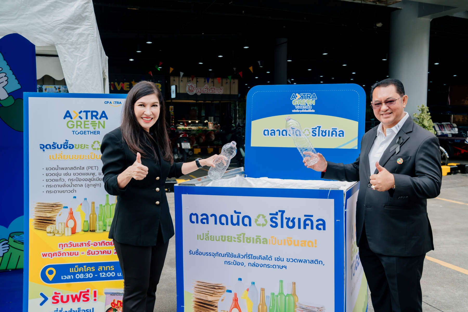 กรุงเทพฯ 10 พฤศจิกายน 2568 – บริษัท ซีพี แอ็กซ์ตร้า จำกัด (มหาชน) ผู้ดำเนินธุรกิจค้าส่งค้าปลีก ‘แม็คโคร-โลตัส’ เดินหน้าสร้างความยั่งยืน ผ่านแคมเปญ “AXTRA Green Together” ภายใต้แนวคิด ‘พลังเล็ก ๆ เพื่อโลกที่ยั่งยืน ผ่านการคัดแยกขยะ โดยล่าสุด ร่วมกับ บริษัท เวสท์บาย เดลิเวอรี่ จำกัด เปิดตัวกิจกรรม “Weekend Recycle Market ตลาดนัดรีไซเคิล ‘รักษ์โลก สร้างรายได้’” เพื่อส่งเสริมการคัดแยกขยะอย่างถูกวิธี ทุกวันเสาร์-อาทิตย์ จนถึงสิ้นปี 2568 ที่แม็คโครและโลตัส 10 สาขาในกรุงเทพฯ พร้อมกันนี้ ยังได้จัดทำโครงการ “RVM by CP AXTRA x Wastebuy” เพื่อติดตั้งเครื่องรับคืนบรรจุภัณฑ์อัตโนมัติ (Reverse Vending Machine – RVM) ในการอำนวยความสะดวกให้ประชาชนสามารถนำขวดพลาสติก มาส่งคืนได้ตลอดเวลา พร้อมรับคะแนนสะสมผ่านระบบดิจิทัล โดยขวดที่เก็บรวบรวมจะถูกนำเข้าสู่กระบวนการรีไซเคิลต่อเนื่อง เพื่อสร้างเศรษฐกิจหมุนเวียนและทรัพยากรที่ยั่งยืน โดยมี นายพรพรหม วิกิตเศรษฐ์ ผู้บริหารด้านความยั่งยืนของกรุงเทพมหานคร และ ที่ปรึกษาของผู้ว่าราชการกรุงเทพมหานคร และ ดร.ผานิต รัตสุข ผู้อำนวยการกองจัดการกากของเสียและสารอันตราย กรมควบคุมมลพิษ ให้เกียรติร่วมงานเปิดตัวกิจกรรม