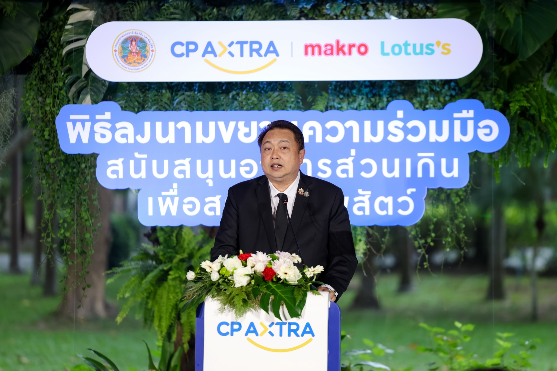 นายสุชาติ ชมกลิ่น รองนายกรัฐมนตรี และรัฐมนตรีว่าการกระทรวงทรัพยากรธรรมชาติและสิ่งแวดล้อม กล่าวว่า “ความร่วมมือระหว่างกรมอุทยานฯ และ ซีพี แอ็กซ์ตร้า ถือเป็นแบบอย่างของการขับเคลื่อนนโยบายสู่การปฏิบัติจริงในระดับพื้นที่ โดยการนำอาหารส่วนเกินที่ยังสามารถบริโภคได้ มาบริจาคเพื่อเป็นอาหารให้แก่สัตว์ป่าในสถานีเพาะเลี้ยงสัตว์ป่า และศูนย์ช่วยเหลือสัตว์ป่า นับเป็นการเปลี่ยนของเหลือทิ้งให้กลายเป็นทรัพยากร สามารถช่วยแก้ปัญหาทั้งขยะอาหารและการดูแลสัตว์ป่าไปพร้อมกัน สะท้อนถึงความมุ่งมั่นของกรมอุทยานฯ ที่ไม่เพียงมองปัญหาขยะในมิติของความสะอาดเท่านั้น แต่ยังมองเห็นความเชื่อมโยงระหว่างการจัดการขยะ การลดก๊าซเรือนกระจก และการอนุรักษ์ทรัพยากรธรรมชาติอย่างยั่งยืน สอดคล้องกับนโยบาย ‘ประเทศไทยสู่สังคมคาร์บอนต่ำ’ และเป้าหมาย Net Zero Emissions ที่รัฐบาลกำหนดไว้”