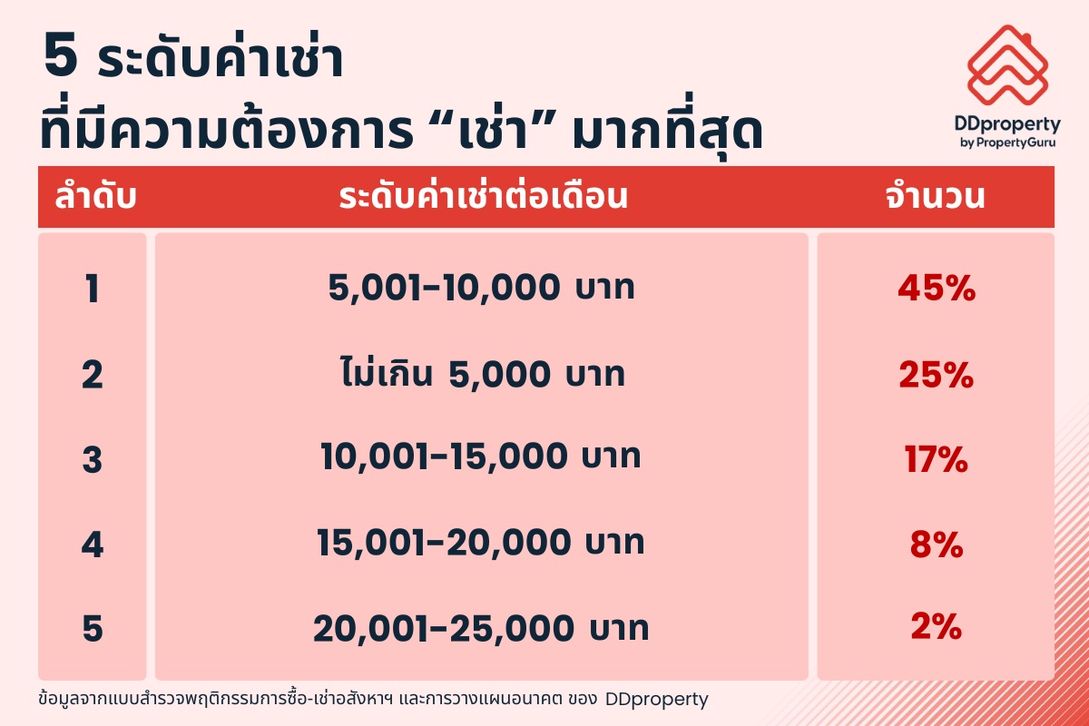 สำหรับอัตราค่าเช่าที่ได้รับความสนใจมากที่สุดจะอยู่ในช่วง 5,001-10,000 บาท/เดือน สัดส่วน 45% สะท้อนให้เห็นถึงเทรนด์ที่ผู้เช่ายินดีจ่ายเพิ่มขึ้นเล็กน้อยเพื่อแลกกับคุณภาพการอยู่อาศัยที่ดีกว่า เช่น ได้อยู่ในทำเลใกล้ที่ทำงาน, เดินทางสะดวก หรือโครงการมีสิ่งอำนวยความสะดวกครบครัน ซึ่งตอบโจทย์การใช้ชีวิตได้ดีกว่า รองลงมาคืออัตราค่าเช่าไม่เกิน 5,000 บาท/เดือน และ 10,001-15,000 บาท/เดือน (สัดส่วน 25% และ 17% ตามลำดับ)