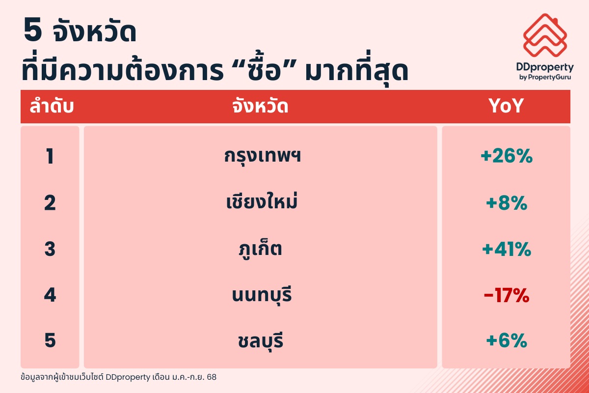 สะท้อนได้จากผู้เข้าชมเว็บไซต์ DDproperty พบว่า ความต้องการซื้อยังมีอยู่ ในช่วง 9 เดือนแรกของปี 2568 ความต้องการซื้อใน 5 จังหวัดแรกที่มีผู้เข้าชมมากที่สุด ส่วนใหญ่เพิ่มขึ้นจากปีก่อนหน้า โดยความต้องการซื้อในกรุงเทพฯ เพิ่มขึ้นมากที่สุดถึง 26% YoY