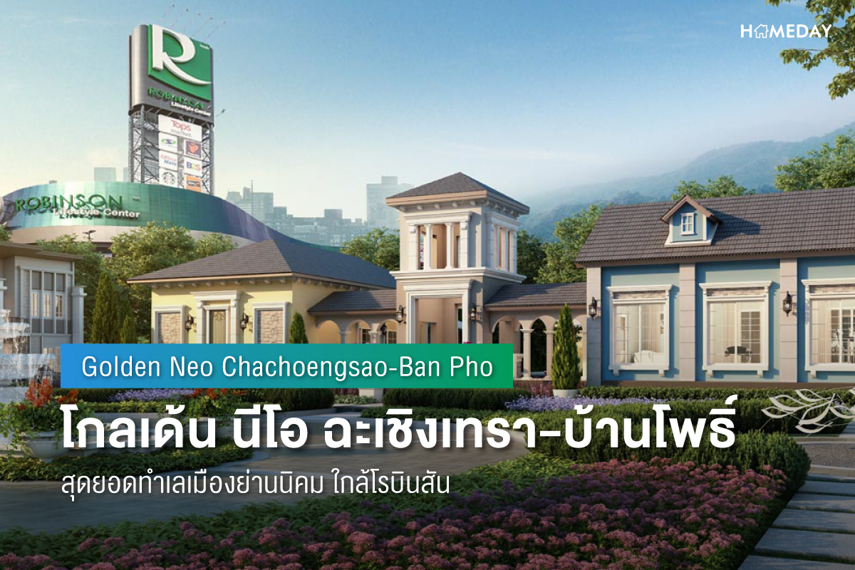 "โกลเด้น นีโอ ฉะเชิงเทรา-บ้านโพธิ์ (Golden Neo Chachoengsao-Ban Pho) สวย GOOD DESIGN ด้วยกลิ่นอายสถาปัตยกรรมยุโรปร่วมสมัย ให้ความโอ่อ่าภูมิฐาน หิน บัวประดับ ปูนปั้น เหล็กดัดแนวระเบียงลวดลายพิเศษ ช่วยเพิ่มความหรูหรา มาตรฐานวัสดุชั้นนำ กระเบื้องห้องน้ำดีไซน์พิเศษ ประตู หน้าต่าง UPVC โคมไฟ Downlight ทั้งหลัง ฝ้าเพดานสูง 2.7 เมตร"