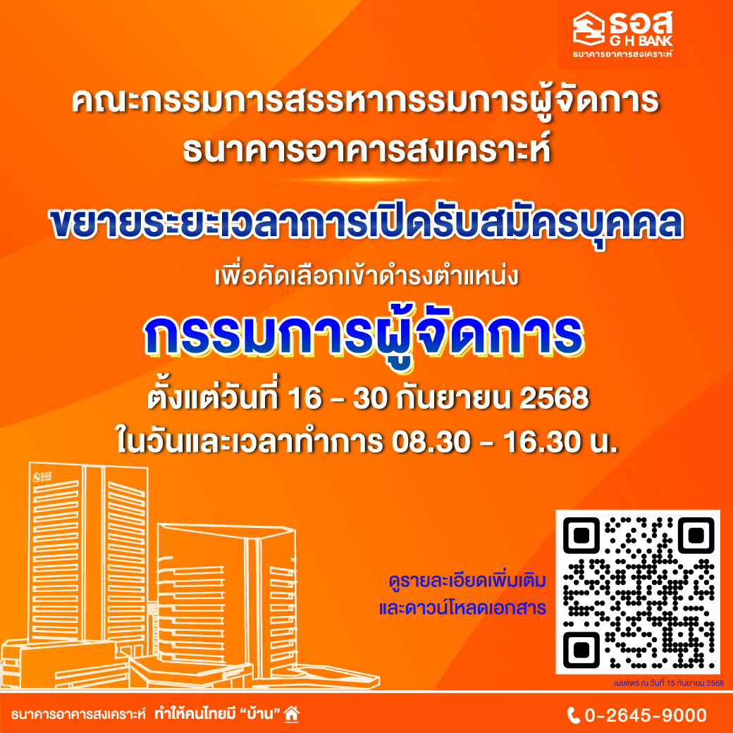 กรรมการผู้จัดการธนาคารอาคารสงเคราะห์ ตั้งแต่วันที่ 16 – 30 กันยายน 2568 โดยคุณสมบัติทั่วไปของผู้สมัคร ต้องมีสัญชาติไทย อายุไม่เกิน 58 ปีบริบูรณ์ในวันยื่นใบสมัคร สามารถทำงานให้ธนาคารได้เต็มเวลา และไม่มีลักษณะต้องห้ามตามประกาศคณะกรรมการสรรหากรรมการผู้จัดการธนาคารอาคารสงเคราะห์ สำหรับคุณสมบัติเฉพาะต้องมีความรู้ความเข้าใจ ประสบการณ์ทางด้านการเงินการธนาคารและเศรษฐกิจเป็นอย่างดี มีวิสัยทัศน์ทางด้านการเงินการธนาคาร