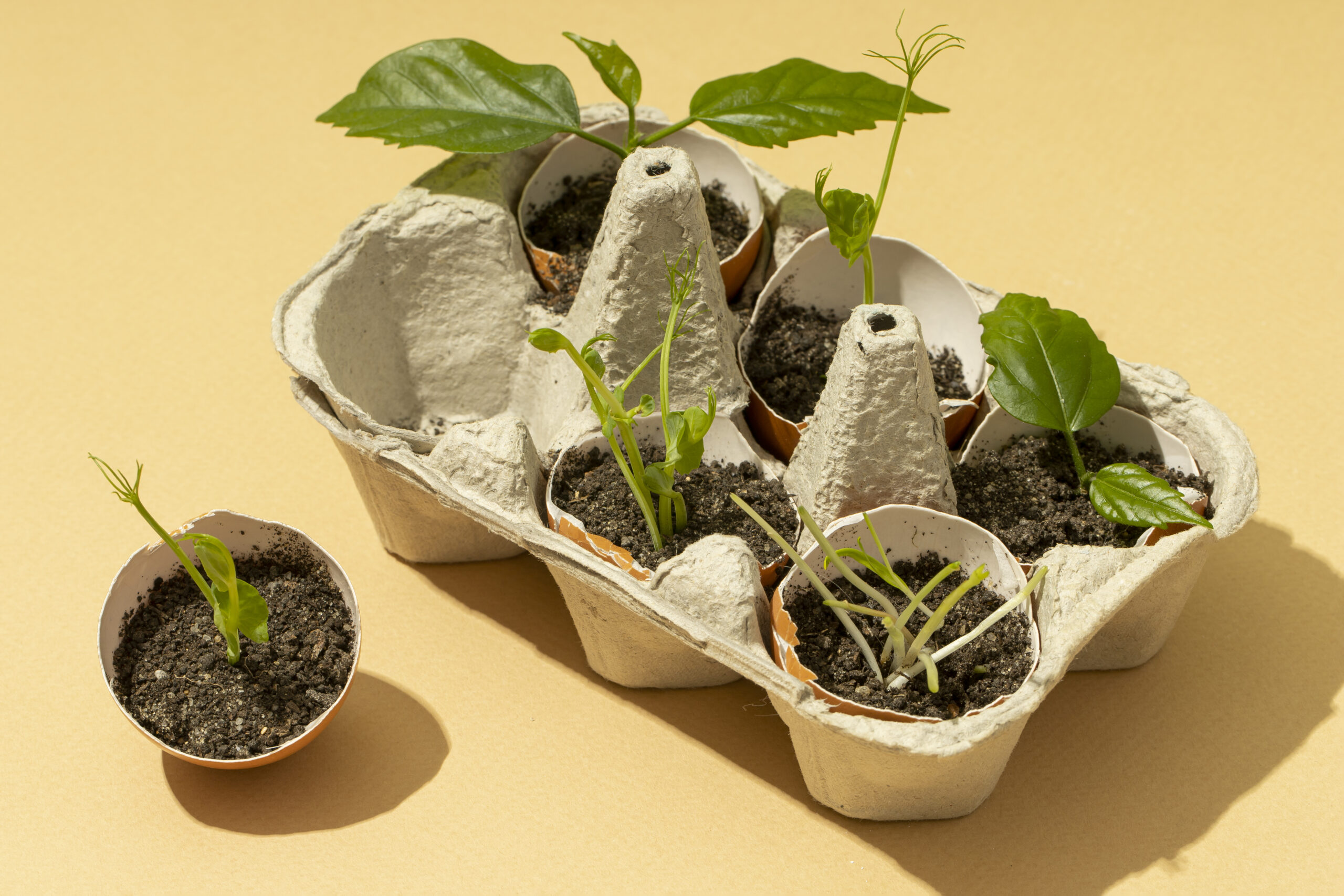 เปลือกไข่เป็นวัสดุธรรมชาติที่มีประโยชน์อย่างมากในการเพาะกล้าผัก เนื่องจากมีแคลเซียมสูงถึง 39.15% พร้อมด้วยไนโตรเจน 0.4% และแมกนีเซียม 0.38% ซึ่งเป็นธาตุอาหารที่จำเป็นต่อการเจริญเติบโตของพืช วิธีการเพาะกล้าในเปลือกไข่ทำได้โดยเจาะรูเล็กๆ ด้านล่างเปลือกไข่ เพื่อระบายน้ำ จากนั้นใส่ดินหรือวัสดุเพาะกล้าลงไป หยอดเมล็ดผักที่ต้องการ และรดน้ำให้ชุ่มแต่ไม่แฉะ เมื่อต้นกล้าโตพอสมควรแล้ว สามารถบีบเปลือกไข่ให้แตกเล็กน้อยแล้วฝังลงไปในกระถางใหญ่ได้เลย เพราะเปลือกไข่จะย่อยสลายกลายเป็นปุ๋ยธรรมชาติ