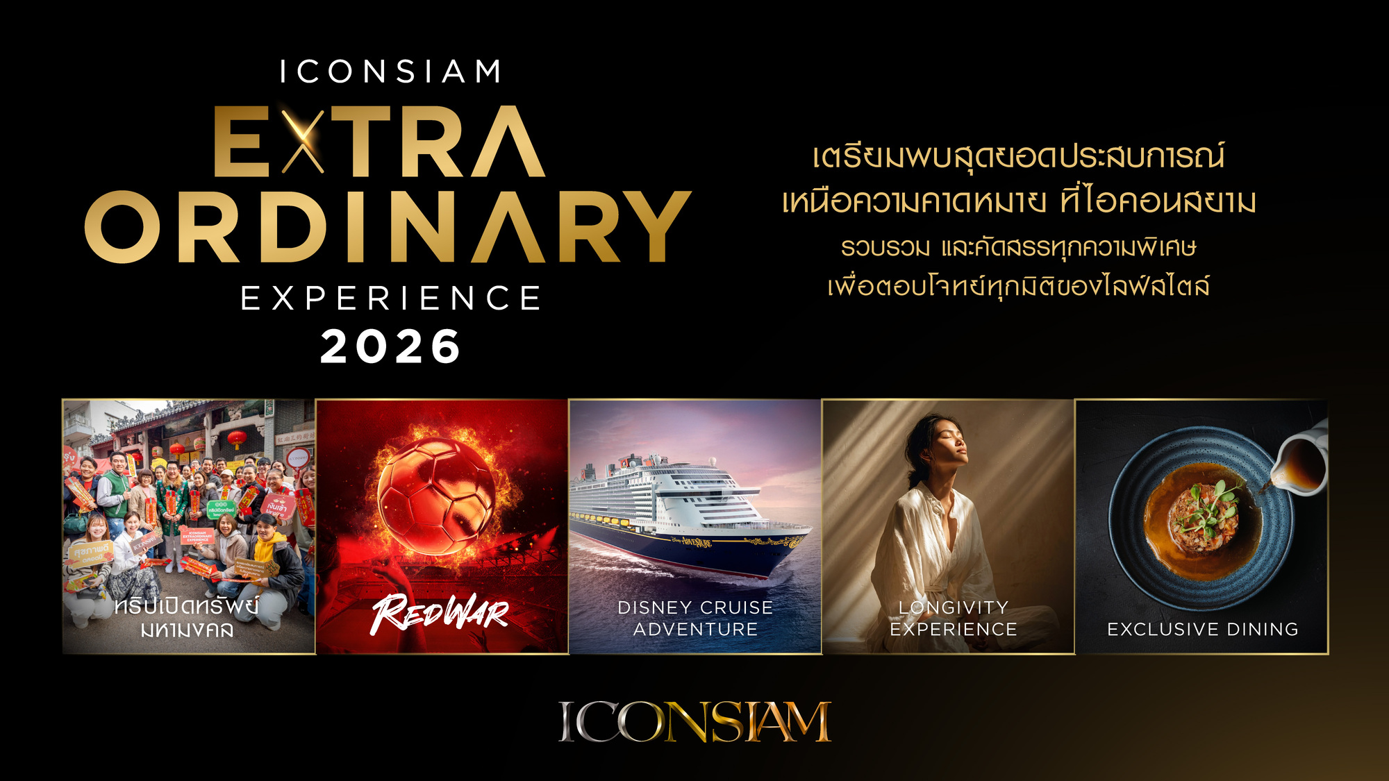 (กรุงเทพฯ – 13 มกราคม 2569) – ไอคอนสยาม แลนด์มาร์กระดับโลกริมแม่น้ำเจ้าพระยา ตอกย้ำการเป็นจุดหมายปลายทางที่มอบประสบการณ์แตกต่างและเหนือระดับ ประกาศเปิดตัวแคมเปญใหญ่แห่งปี “ICONSIAM Extraordinary Experience” นำเสนอ 5 มิติการใช้ชีวิตที่คัดสรรมาเป็นพิเศษเพื่อตอบโจทย์ลูกค้าคนสำคัญ ผ่านการเดินทางร่วมทริปแห่งศรัทธาเสริมสิริมงคลเปิดทรัพย์ที่ฮ่องกง, ชมฟุตบอลแมตช์หยุดโลกแบบ VIP ที่อังกฤษ, ออกเดินทางสู่โลกแห่งจินตนาการล่องเรือสำราญดิสนีย์กับครอบครัว, เปิดประสบการณ์การดูแลสุขภาพเชิงลึกเพื่อชีวิตที่ยืนยาวอย่างมีระดับ และสัมผัสสุนทรียศาสตร์กับสุดยอดเมนูจากเชฟชื่อดัง เพื่อตอกย้ำความแข็งแกร่งในฐานะผู้นำที่สร้างสรรค์ปรากฏการณ์ใหม่ระดับโลกอย่างไม่หยุดนิ่ง โดยมุ่งเน้นการส่งมอบความพิเศษเฉพาะตัวที่เงินเพียงอย่างเดียวอาจไม่สามารถหาซื้อได้ (Money-Can’t-Buy Experiences) ประเดิมกิจกรรมแรกด้วยทริปแห่งศรัทธาที่ประสบความสำเร็จอย่างต่อเนื่องเป็นปีที่ 3 เพื่อมอบเป็นของขวัญและส่งต่อความสิริมงคลให้แก่ลูกค้าอย่างสมบูรณ์แบบที่สุด