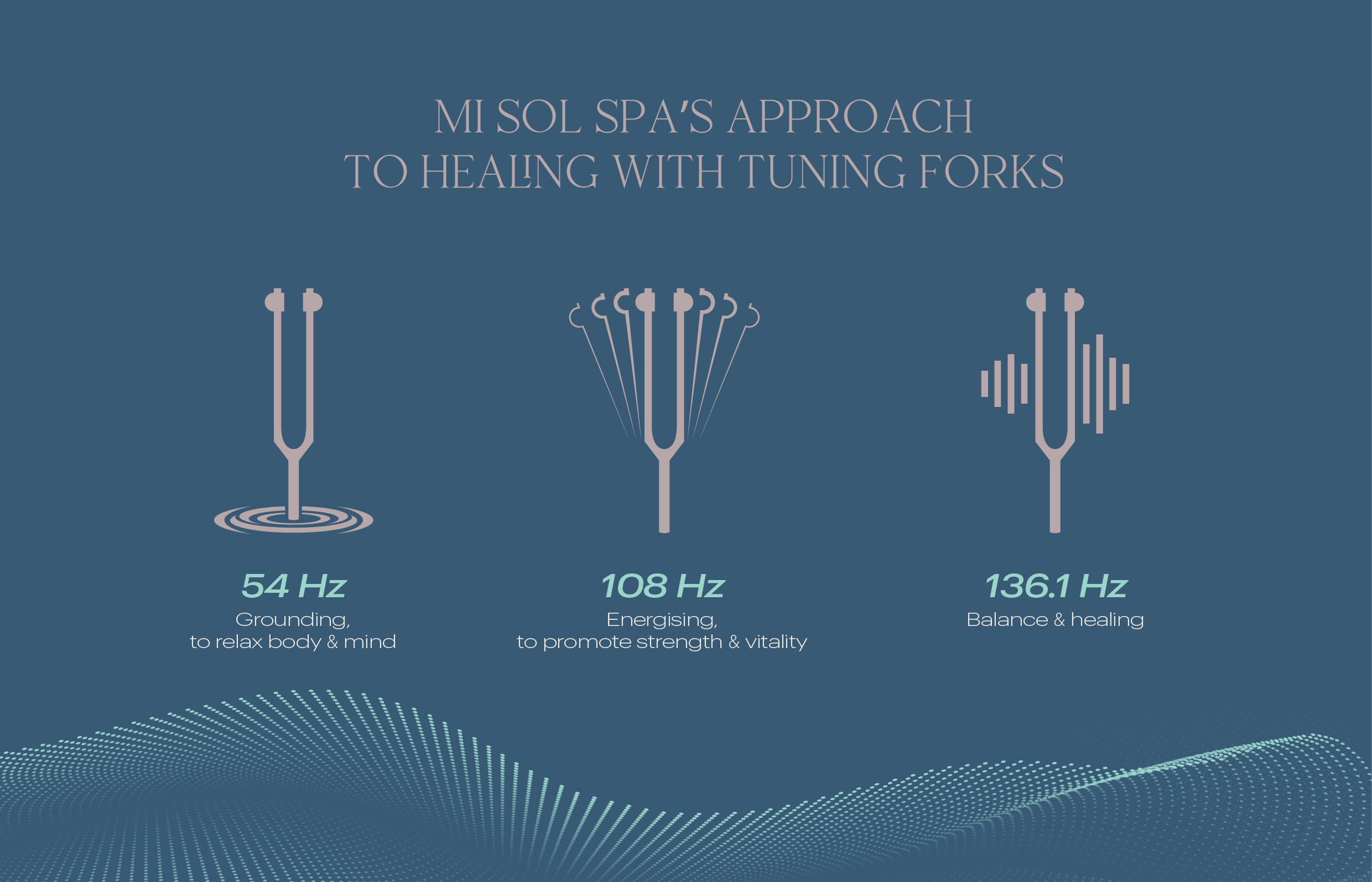 Mi Sol Spa ใช้ส้อมเสียงจำนวนสามอัน ซึ่งแต่ละอันถูกคัดเลือกจากความถี่ที่มีคุณสมบัติในการสร้างความมั่นคงและการฟื้นฟูร่างกายและจิตใจอย่างลึกซึ้งดังนี้: