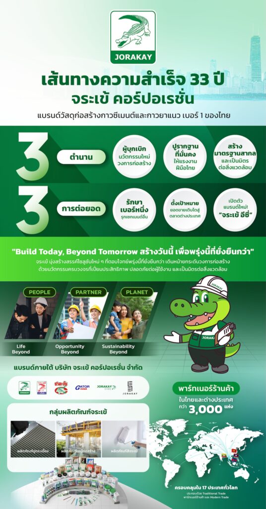 ในโอกาสครบรอบ 33 ปีแห่งความสำเร็จ จระเข้ คอร์ปอเรชั่น พร้อมเปิดบทใหม่ด้วยแนวคิด “Build Today, Beyond Tomorrow สร้างวันนี้เพื่อพรุ่งนี้ที่ยั่งยืนกว่า” ผ่านการเผยโฉม “3 ตำนาน” ที่สร้างมาตรฐานใหม่ให้วงการก่อสร้าง และ “3 การต่อยอด” ที่จะพาแบรนด์นวัตกรรมก่อสร้างสัญชาติไทยสู่ตลาดโลกอย่างยั่งยืน โดยในครึ่งปีแรกของปี 2568 จระเข้ เติบโตแข็งแกร่ง พร้อมด้วยเป้าหมายยอดขายเติบโตในต่างประเทศ