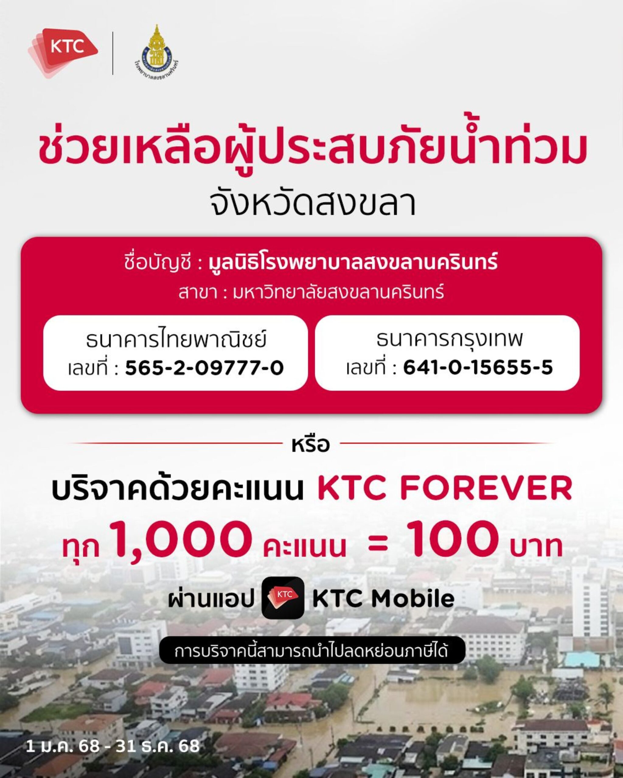 “เคทีซี” หรือ บริษัท บัตรกรุงไทย จำกัด (มหาชน) ชวนสมาชิกบัตรฯ ร่วมสมทบทุนช่วยเหลือ ผู้ประสบอุทกภัยในภาคใต้ ผ่านสภากาชาดไทย มูลนิธิโรงพยาบาลสงขลานครินทร์ และมูลนิธิรักษ์ไทย โดยสามารถเลือกชำระเงินบริจาคด้วยบัตรเครดิตเคทีซีที่มูลนิธิฯ หรือใช้คะแนน KTC FOREVER ทุก 1,000 คะแนนแทนเงินบริจาค 100 บาท ผ่านแอป KTC Mobile เพื่อช่วยสนับสนุนการจัดหาอาหาร ยารักษาโรค อุปกรณ์ ยังชีพ และการฟื้นฟูพื้นที่ไปยังชุมชนที่กำลังเผชิญสถานการณ์อย่างเร่งด่วน