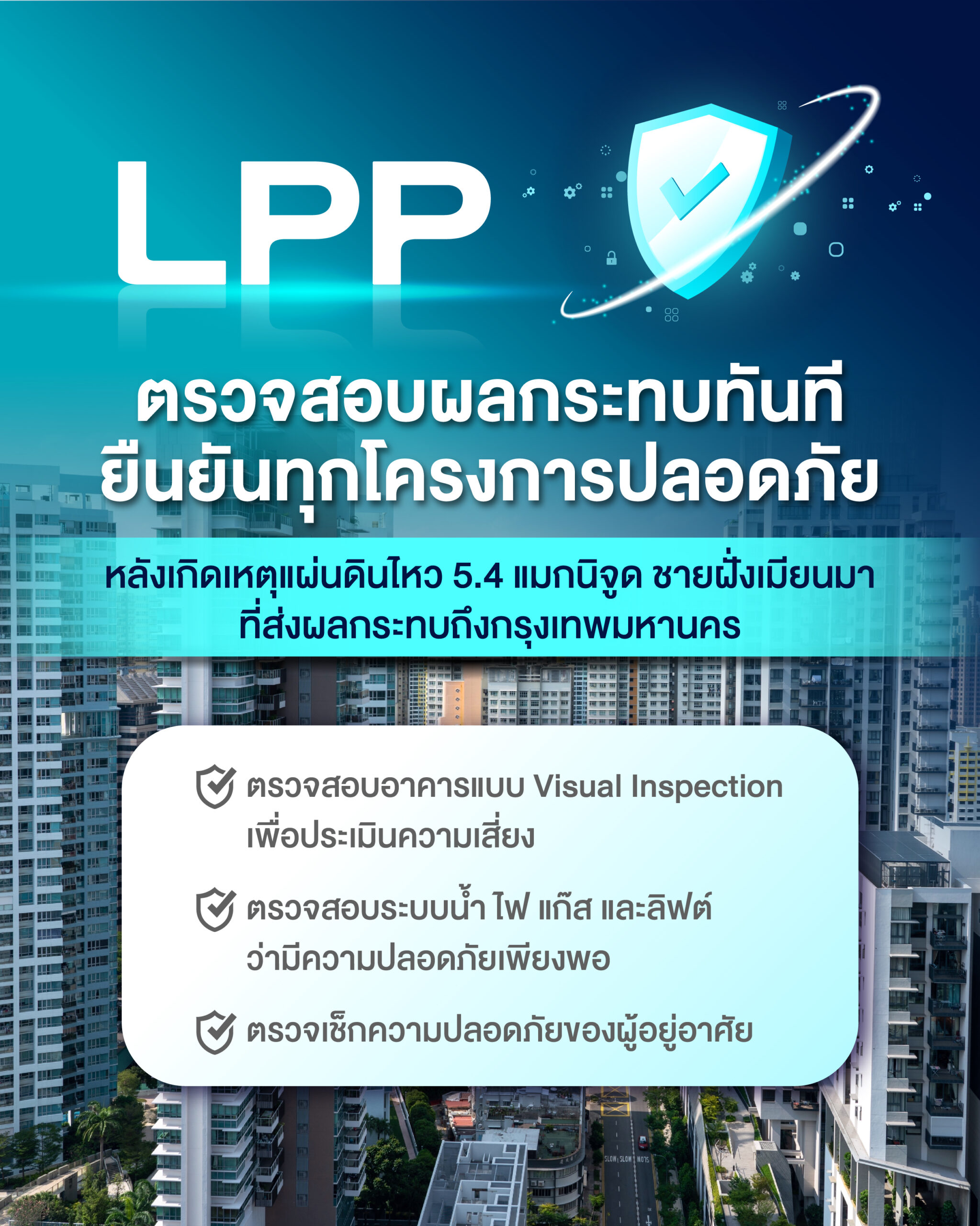 LPP ได้ตรวจสอบอาคารแบบ Visual Inspection โดยทีมวิศวกรและทีมช่างประจำโครงการ เพื่อประเมินความเสี่ยงของโครงการ และพื้นที่ส่วนกลาง ตรวจสอบระบบน้ำ ไฟ แก๊ส และลิฟต์ ว่ามีความปลอดภัยไม่พบความผิดปกติ รวมถึงตรวจเช็กความปลอดภัยของผู้อยู่อาศัยโดยเฉพาะไม่ให้เกิดความตื่นตระหนก ทั้งนี้หลังจากทำการตรวจสอบในเบื้องต้นทุกโครงการ พบว่า ยังไม่มีความเสียหายใดๆ ต่อโครงสร้างอาคาร และระบบต่างๆ ภายในโครงการยังคงปลอดภัย สามารถทำงานได้ตามมาตรฐานและเป็นปกติ