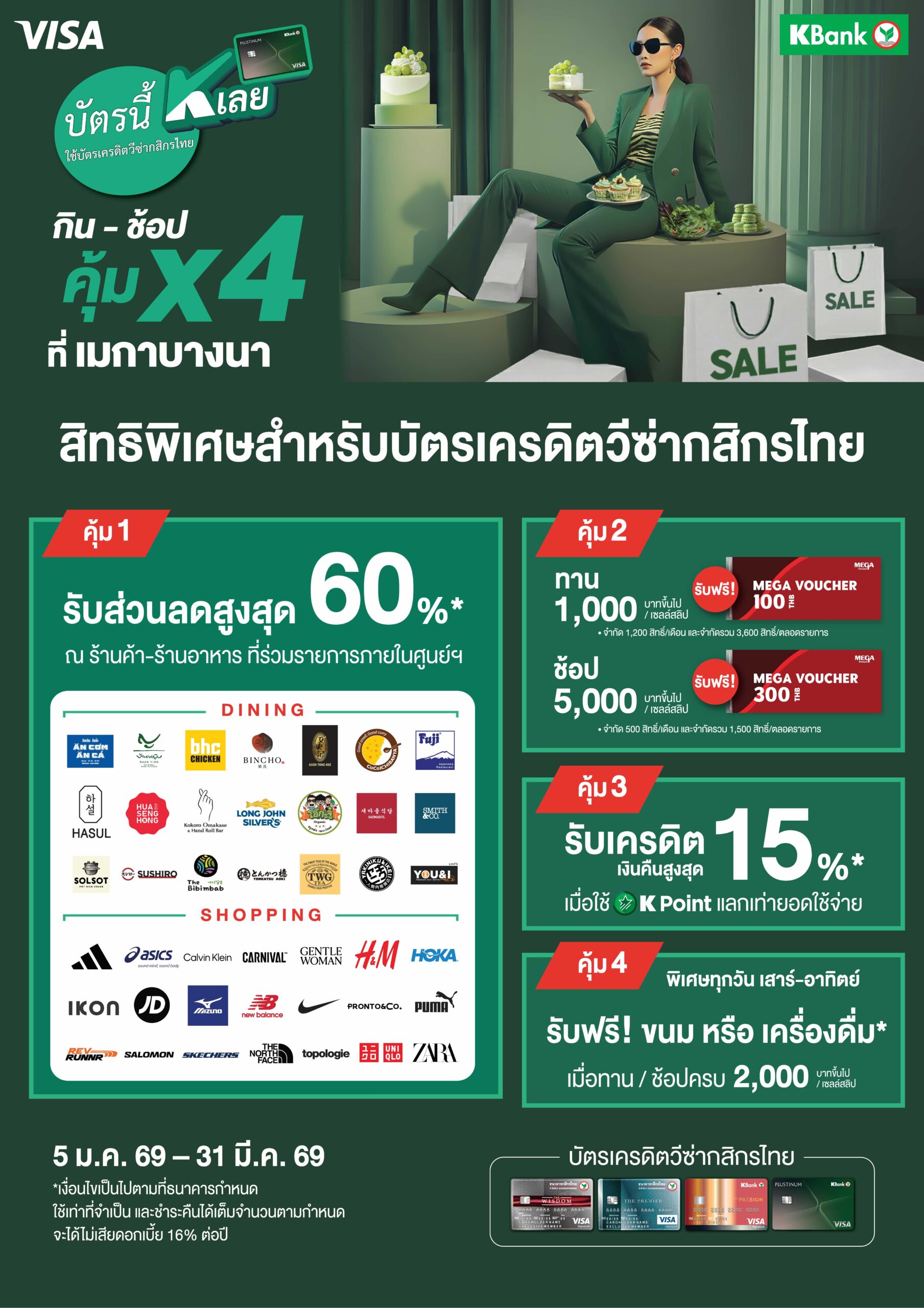 ผู้อำนวยการฝ่าย Credit Card Product and Marketing Management Department ธนาคารกสิกรไทย ร่วมมอบสิทธิพิเศษสุดคุ้มให้กับผู้ถือบัตรเครดิตวีซ่ากสิกรไทย กับแคมเปญ “กิน-ช้อป คุ้ม X4 ที่เมกาบางนา*” ตั้งแต่วันที่ 5 มกราคม 2569 – 31 มีนาคม 2569 ยกระดับประสบการณ์ความสุขที่ตอบโจทย์ทุกไลฟ์สไตล์การใช้ชีวิตของลูกค้า ทั้งการรับประทานอาหาร การช้อปปิ้ง ผ่านสิทธิประโยชน์สุดคุ้ม 4 ต่อ เฉพาะที่เมกาบางนาเท่านั้น