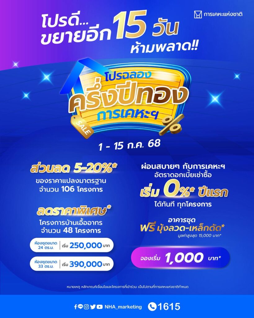 ผู้สนใจจองบ้านกับแคมเปญ “ฉลองครึ่งปีทอง กับการเคหะแห่งชาติ” สามารถจองได้ที่สำนักงานใหญ่การเคหะแห่งชาติ ศูนย์ขายสำนักงานเคหะนครหลวง และสำนักงานเคหะจังหวัดทุกแห่งทั่วประเทศ หรือสอบถามรายละเอียดเพิ่มเติมได้ที่ Call Center 1615 หรือ Facebook: NHA marketing, Facebook: การเคหะแห่งชาติ ถึงวันที่ 15 กรกฏคม 2568