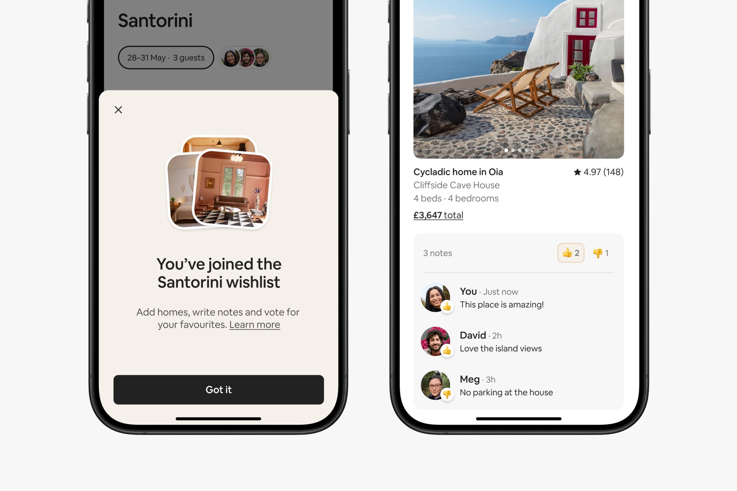 • Wishlist ที่แชร์ได้Airbnb ได้เปิดตัว Wishlist เมื่อสิบปีก่อนโดยมีผู้เข้าพักในประเทศไทยสร้างรายการโปรด (Wishlist) มากกว่า 3.7 ล้านรายการ เพื่อช่วยวางแผนในการเดินทาง ปัจจุบันผู้เข้าพักสามารถแชร์ Wishlist กับเพื่อนร่วมทริปได้อย่างง่ายดาย ชวนให้เพิ่มที่พัก เขียนโน้ต หรือโหวตว่าต้องการพักที่ไหน ก็ทำได้สบายๆ เมื่อคุณส่งลิงก์ที่พักให้คนอื่นดู แอปจะสร้าง Wishlist ซึ่งรวมที่พักเหล่านี้ไว้ ทั้งนี้ในทุกการเดินทางแบบกลุ่มจะมีสมาชิกในกลุ่มที่คอยวางแผนเพื่อให้ผู้ร่วมทริปสนุกกับการเดินทาง ในประเทศไทยนักเดินทางผู้หญิงสร้าง Wishlist บน Airbnb มากกว่านักเดินทางผู้ชายถึง 79%1