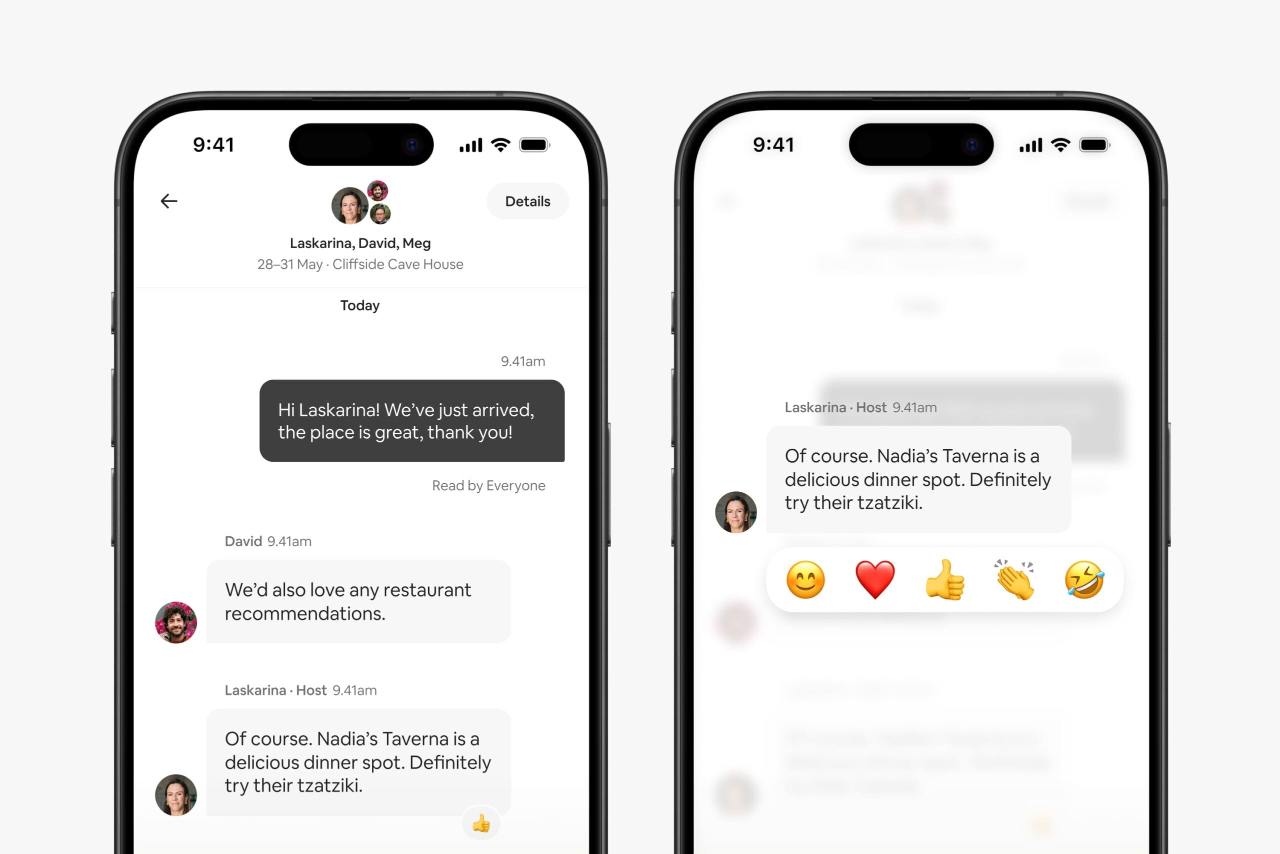 • แท็บข้อความใหม่ การส่งข้อความเป็นส่วนสำคัญของประสบการณ์บน Airbnb ในปีที่แล้วมีผู้ใช้งานส่งข้อความมากกว่า 3 พันล้านข้อความ2 รวมทั้งหมดมากกว่า 15,000 ล้านข้อความได้ถูกส่งบน Airbnb3 และแท็บข้อความโฉมใหม่สามารถทำให้ทุกคนในทริปส่งข้อความคุยกับโฮสต์ได้ในแชทกลุ่มเดียวกัน โดยมีดีไซน์เรียบง่าย รวมข้อความจากผู้เข้าพัก โฮสต์และฝ่ายสนับสนุนลูกค้าไว้ในที่เดียว ทำให้ค้นหาข้อความต่างๆ ได้ง่ายขึ้น สามารถกดอีโมจิแสดงความรู้สึกได้ และเทมเพลตข้อความที่ AI แนะนำจะช่วยให้โฮสต์ตอบคำถามทั่วไปได้ทันที
