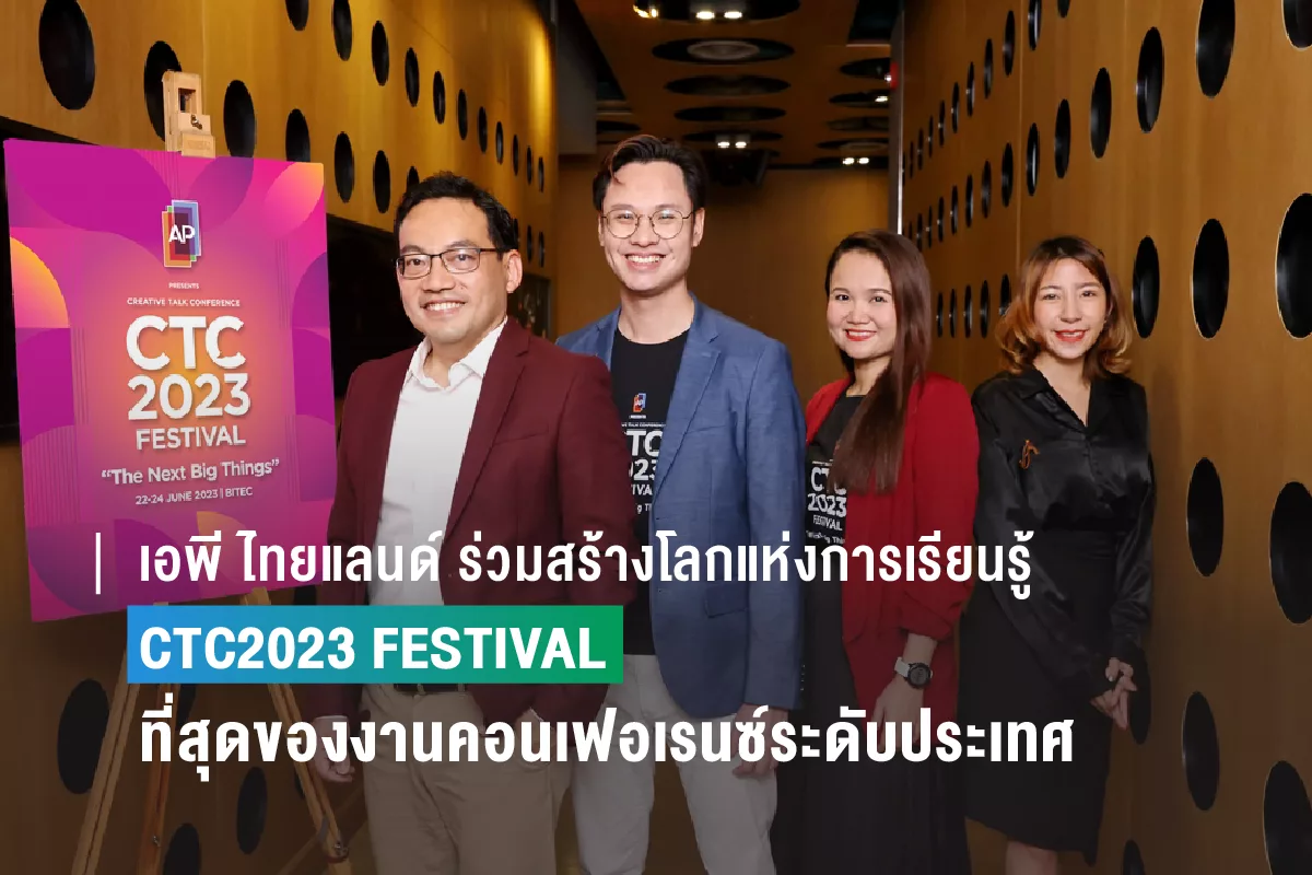 • จับมือพาร์ตเนอร์ประเดิมโปรเจกต์ยักษ์ CTC2023 FESTIVAL – The Next Big Things ชวนค้นหาสิ่งใหม่ ที่จะสร้างการเปลี่ยนแปลงครั้งยิ่งใหญ่ เรียนรู้เต็มที่ 3 วัน 3 คอนเฟอเรนซ์ใหญ่ MIT Marketing Insight and Technology Conference – People Performance Conference – Creative Talk Conference