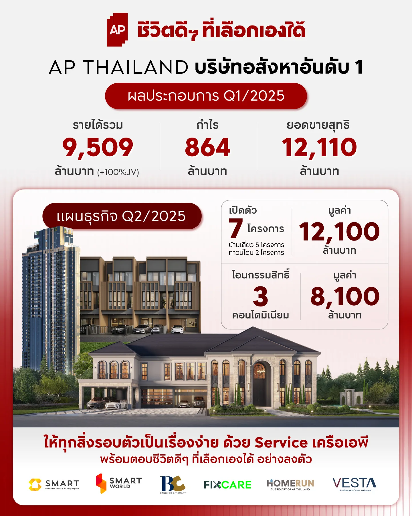 “ทั้งนี้ ภาพรวมเศรษฐกิจไทยในไตรมาส 2 ของปีนี้ยังถือว่ามีความท้าทายรออยู่อีกมาก และเชื่อว่าจะเป็นอีกปีที่ไม่ได้ง่าย ด้วยปัจจัยต่างๆ ที่ส่งผลกระทบต่อเนื่องมาจากปีที่แล้วอย่างเลี่ยงไม่ได้ ถึงแม้ภาครัฐจะเริ่มมีการออกมาตรการกระตุ้นเศรษฐกิจและภาคอสังหาริมทรัพย์ อาทิ การลดค่าโอน-จดจำนอง การพิจารณาผ่อนเกณฑ์ LTV สำหรับผู้ซื้อบ้านหลังแรก และการกระตุ้นการใช้จ่ายในประเทศ และสิ่งที่จะช่วยให้เรายังคงแข็งแกร่งท่ามกลางพายุนี้ได้คือ การรักษาเสถียรภาพทางการเงิน ซึ่งถือเป็นหัวใจสำคัญของการดำเนินธุรกิจในยุคที่ทุกอย่างเปลี่ยนแปลงเร็ว ซึ่งเอพีเราให้ความสำคัญอย่างมากกับการบริหารกระแสเงินสด การควบคุมต้นทุน ตลอดจนการรักษาความสามารถในการเข้าถึงแหล่งเงินทุนที่มีคุณภาพ เพื่อให้สามารถเดินหน้าได้อย่างมั่นคง ไม่ว่าจะอยู่ในสถานการณ์แบบใด”