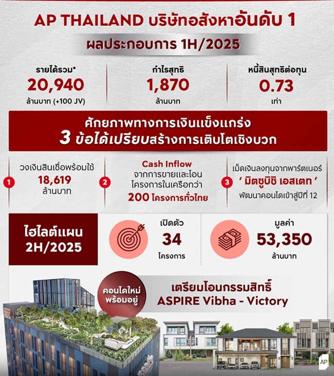 • เอพี ไทยแลนด์ ภายใต้คำมั่นสัญญา ชีวิตดีๆ ที่เลือกเองได้ เผยตัวเลขผลการดำเนินงานครึ่งปีแรก เติบโตสูงสุดในอุตสาหกรรม ยืนหนึ่งด้วยรายได้รวม 20,940 ล้านบาท กำไรสุทธิ 1,870 ล้านบาท สัดส่วนหนี้สินสุทธิต่อทุนต่ำเพียง 0.73 เท่า