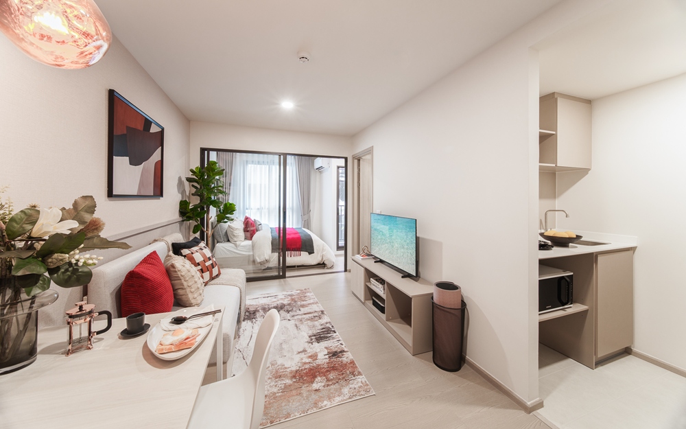 • 1 Bedroom ขนาด 26 ตร.ม. มีให้เลือกทั้งฟังก์ชันครัวติดระเบียงระบายอากาศได้ดี หรือแบบ Grand Living ที่เน้นพื้นที่พักผ่อนขนาดใหญ่
