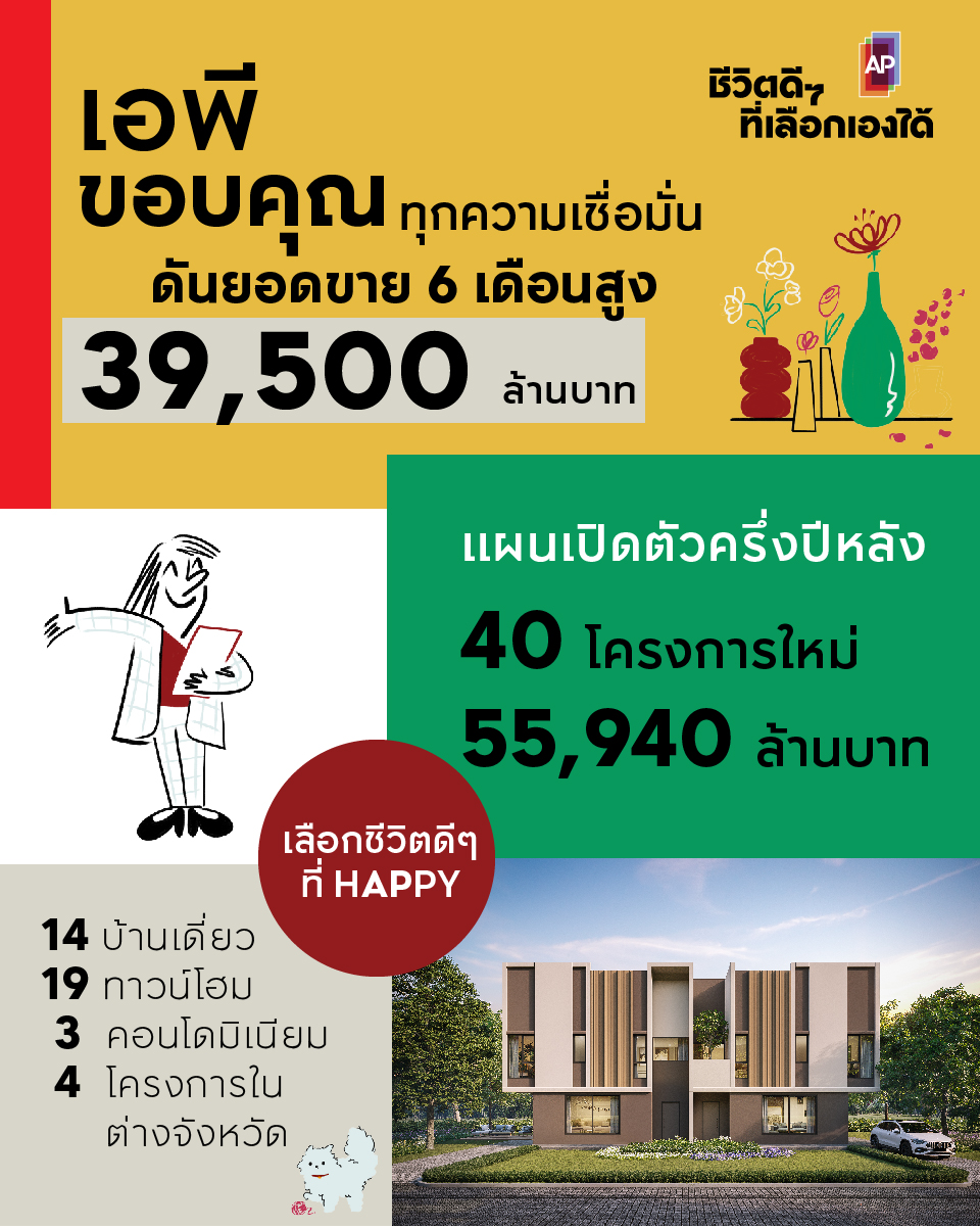 นายวิทการ จันทวิมล รองกรรมการผู้อำนวยการ สายงานกลยุทธ์องค์กรและการสร้างสรรค์ บมจ. เอพี ไทยแลนด์ กล่าวถึงผลการดำเนินงานครึ่งปีแรก โดยสร้างยอดขายได้มากถึง 39,501 ล้านบาท มาจากสินค้าแนวราบมูลค่า 29,307 ล้านบาท และคอนโดมิเนียมที่เริ่มกลับมาเติบโตอย่างมีนัยสำคัญ มูลค่า 10,194 ล้านบาท