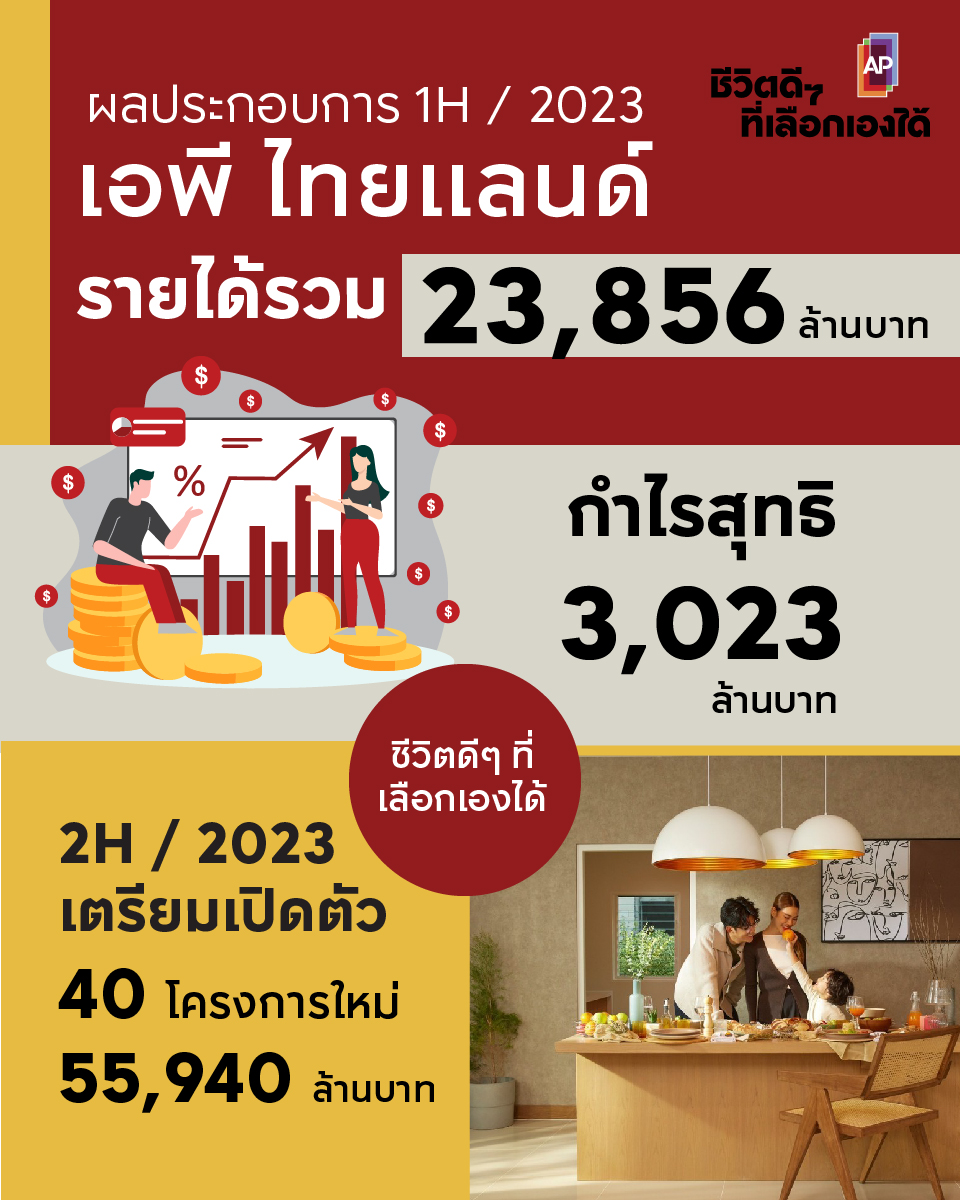 นายวิทการ จันทวิมล รองกรรมการผู้อำนวยการ สายงานกลยุทธ์องค์กรและการสร้างสรรค์ บริษัท เอพี ไทยแลนด์ จำกัด (มหาชน) ผู้นำธุรกิจพัฒนาอสังหาริมทรัพย์ไทย ภายใต้คำมั่นสัญญา “ชีวิตดีๆ ที่เลือกเองได้” กล่าวว่า ผลการดำเนินงานครึ่งปีแรก บริษัทฯ มีอัตราการเติบโตเป็นที่น่าพอใจ โดยมีรายได้รวมจากสินค้าแนวราบ กลุ่มคอนโดมิเนียม (100% JV) และธุรกิจอื่นๆ ได้สูงถึง 23,856 ล้านบาท กำไรสุทธิเท่ากับ 3,023 ล้านบาท ทั้งนี้ ณ ไตรมาส 2 ที่ผ่านมาบริษัทฯ สามารถสร้างรายได้รวมจากสินค้าแนวราบ กลุ่มคอนโดมิเนียม (100% JV) และธุรกิจอื่นๆ ได้สูงถึง 12,051 ล้านบาท เพิ่มขึ้นจากไตรมาสก่อนหน้าที่มีรายได้รวมเท่ากับ 11,805 ล้านบาท ด้านกำไรสุทธิ 1,544 ล้านบาท เพิ่มขึ้นจากไตรมาสก่อนหน้าที่มีกำไรสุทธิรวมเท่ากับ 1,478 ล้านบาท เท่ากับ 4.5%