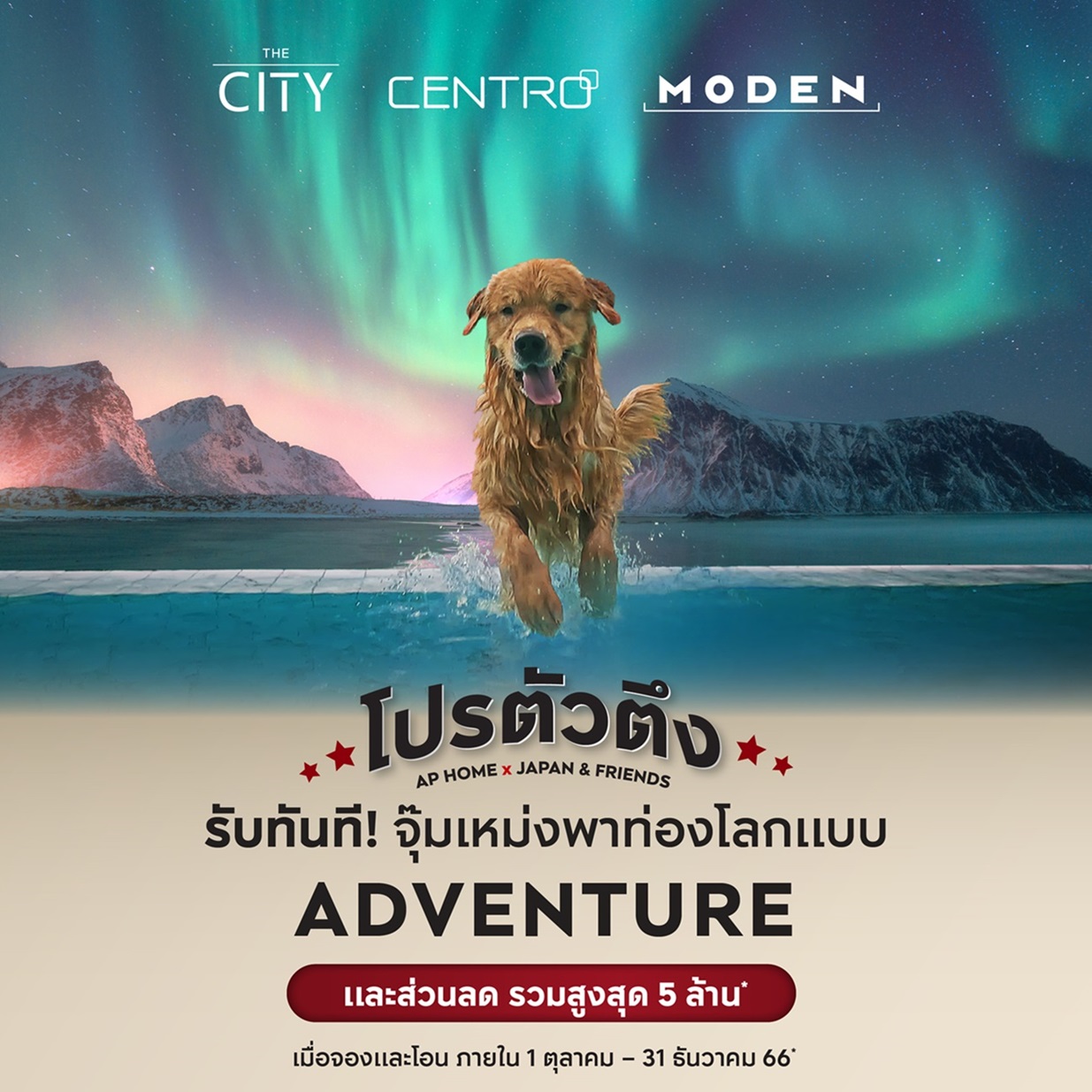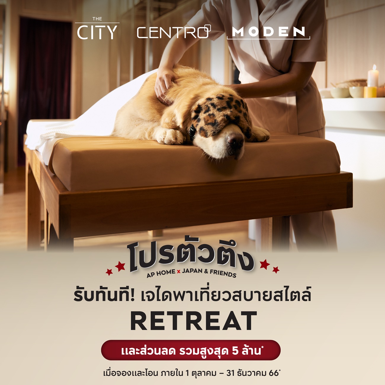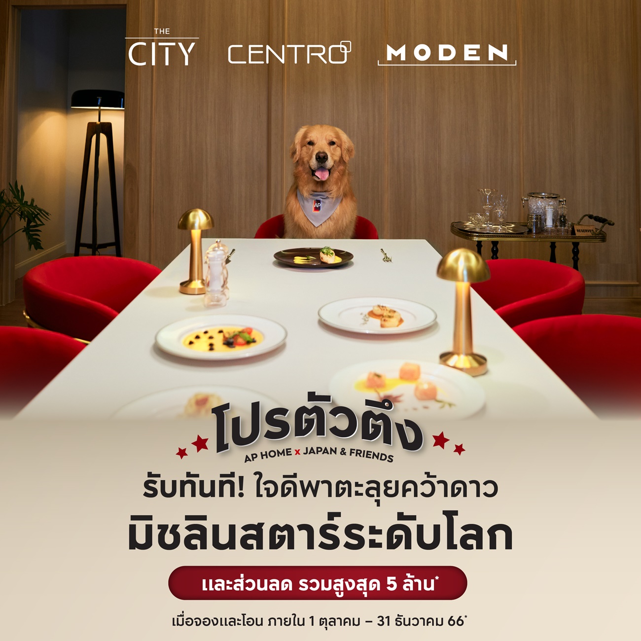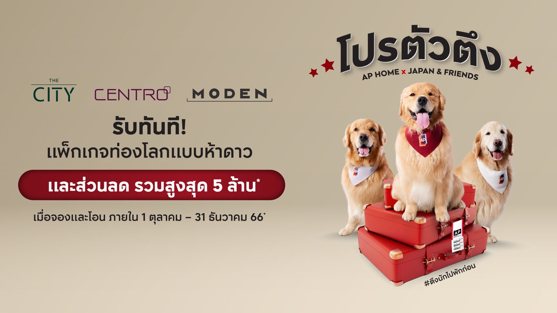 สำหรับรายละเอียดแคมเปญ “โปรตัวตึง – #ตึงนักก็พักก่อน” ประกอบด้วยต่อที่ 1 : เลือกรับแพ็กเกจ ตามใจคุณ มูลค่า 200,000-1,000,000 บาท กับ 3 แพ็กเกจ ได้แก่ จุ๊มเหม่งพาท่องโลกแบบ ADVENTURE – เจไดพาเที่ยวสบายสไตล์ RETREAT – ใจดีพาตะลุยคว้าดาวมิชลินสตาร์ระดับโลก ต่อที่ 2 : ส่วนลดในทุกโครงการที่เข้าร่วมแคมเปญ แบรนด์ THE CITY รับส่วนลดสูงสุดถึง 4 ล้านบาท CENTRO รับส่วนลดสูงสุด 1.4 ล้านบาท และบ้านเดี่ยวแบรนด์น้องใหม่ MODEN รับส่วนลดสูงสุด 400,000 บาท และต่อที่ 3 : โปรลับ รับเพิ่ม! ฟรีค่าใช้จ่าย ณ วันโอน แอร์ และผ้าม่าน ข้อเสนอพิเศษดังกล่าวนี้สำหรับผู้ที่จองและโอนกรรมสิทธิ์ภายในวันนี้ถึง 31 ธันวาคม 2566 นี้เท่านั้น
