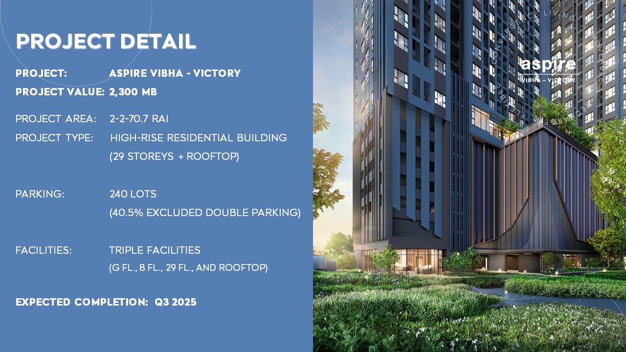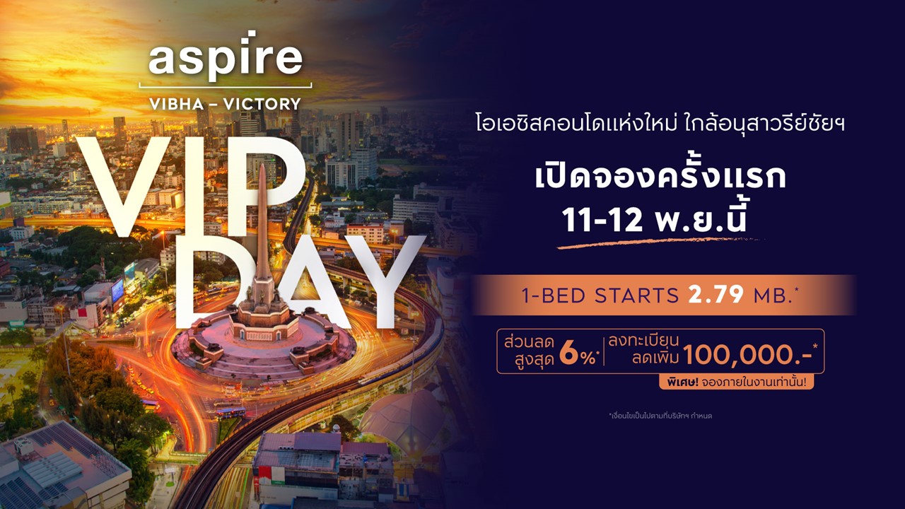 ในช่วงโค้งสุดท้ายของปีนี้ กลุ่มธุรกิจคอนโดมิเนียมเตรียมเปิดตัว 2 โครงการใหม่ มูลค่า 7,300 ล้านบาท ได้แก่ ASPIRE วิภา-วิคตอรี่ คอนโดมิเนียมสูง 29 ชั้น จำนวน 593 ยูนิต มูลค่าโครงการ 2,300 ล้านบาท ราคาเริ่มต้น 100,000 บาท/ตร.ม. หรือ 3.9 ล้านบาท* เตรียมเปิด VIP DAY วันที่ 11-12 พฤศจิกายนนี้ รับส่วนลดพิเศษสูงสุด 6%* เมื่อจองในงาน พร้อมลงทะเบียนรับส่วนลดสูงสุดเพิ่มอีก 100,000 บาท* ที่ https://www.apthai.com/th/condominium/aspire-vibha-victory