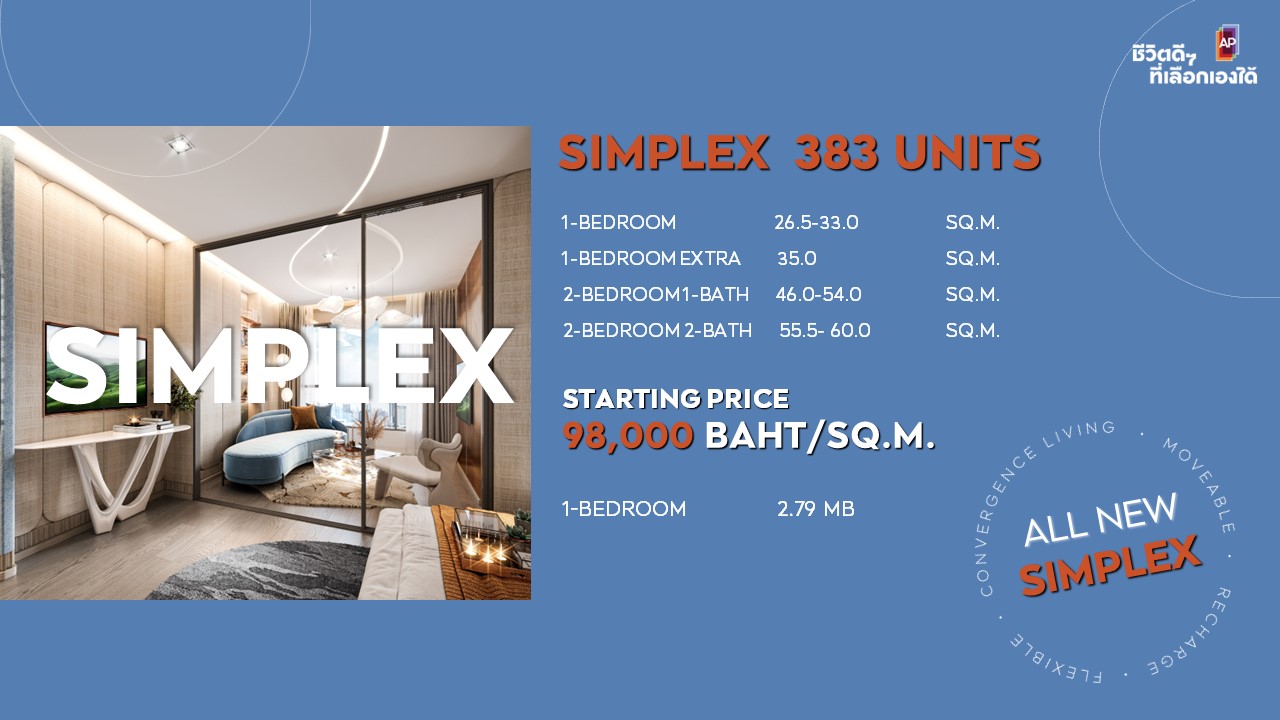 1. ALL NEW SIMPLEX 11 ดีไซน์ ขนาด 26.5 – 60 ตารางเมตร พิเศษกับผังใหม่ 1 Bedroom Extra 35 ตารางเมตร กับ 2 ฟังก์ชันใหม่ Flexible area ที่สามารถปรับเปลี่ยนได้ตามไลฟ์สไตล์ ไม่ว่าจะเป็น Living area หรือ Bedroom ติดอากาศ รวมถึง ห้อง Extra ที่สามารถปรับเปลี่ยนได้ระหว่าง Working area หรือ Walk-in Closet สร้างความรู้สึกใหม่ได้อย่างน่าสนใจ ห้องชุดในสไตล์ ALL NEW SIMPLEX ประกอบด้วยแบบ 1 Bedroom, 1 Bedroom Extra, 2 Bedroom 1 Bath และ 2 Bedroom 2 Bath ราคาเริ่มต้น 1 Bedroom 2.79 ล้านบาท (ราคาเริ่ม 98,000 บาท/ตร.ม.)
