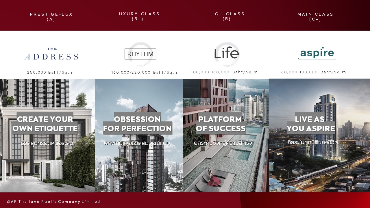 RHYTHM (ริธึ่ม) ลักชัวรีคอนโดมิเนียม ระดับราคา 160,000 – 220,000 ต่อตร.ม. กับจุดยืนของแบรนด์ Obsession for Perfection พิถีพิถันเพื่อชีวิตสมบูรณ์แบบ LIFE (ไลฟ์) ไฮคลาสคอนโดมิเนียม ระดับราคา 100,000 – 160,000 ต่อตร.ม. กับจุดยืนของแบรนด์ Platform of Success ยกระดับชีวิตสู่ความสำเร็จ ASPIRE (แอสปาย) คอนโดแมสเซกเมนต์ที่ดีที่สุด ระดับราคา 60,000 – 100,000 ต่อตร.ม. กับจุดยืนของแบรนด์ Live as You ASPIRE อิสระในทุกมิติของชีวิต
