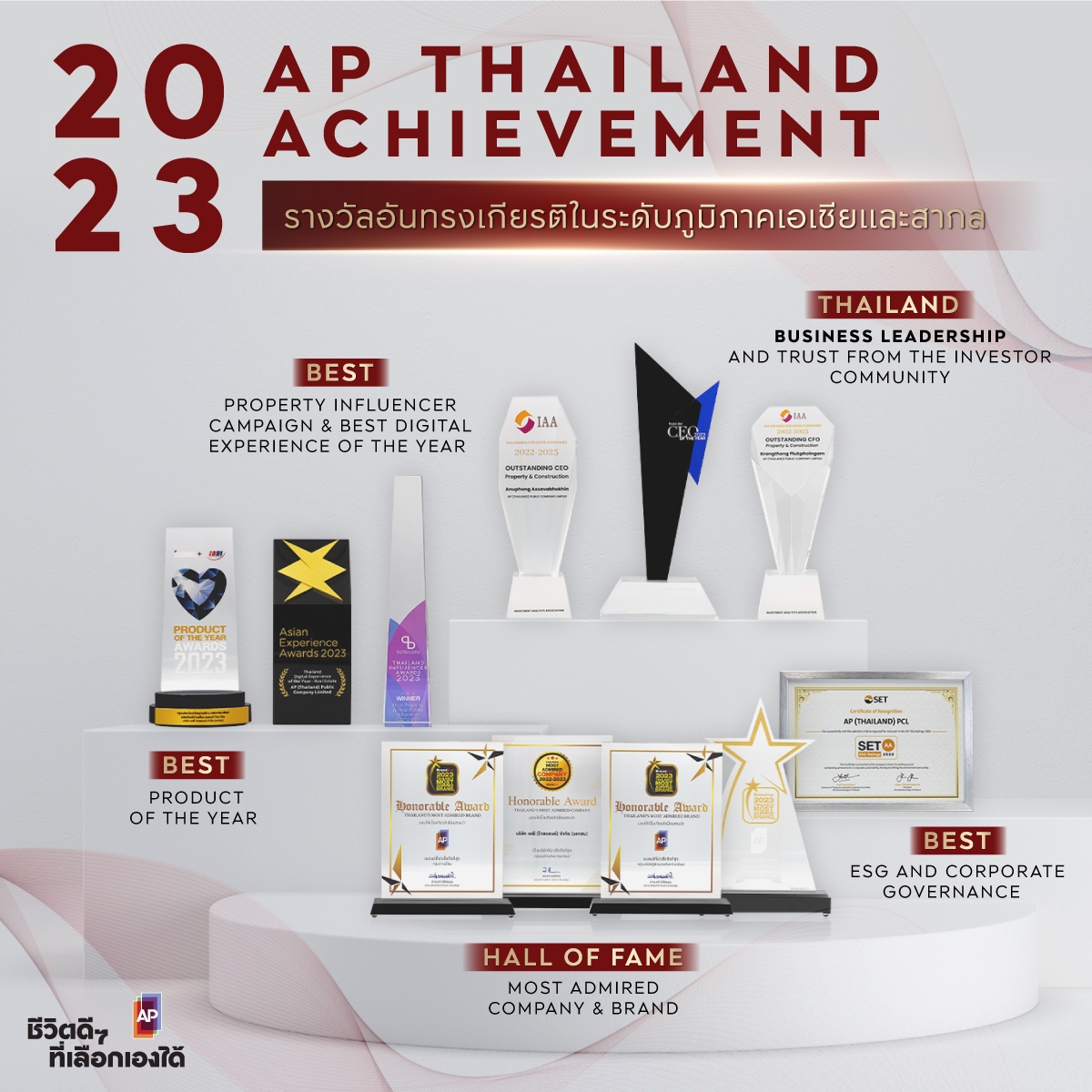 นอกจากความสำเร็จในด้านยอดขายสุทธิ (Net Presales) แล้ว เอพี ไทยแลนด์ ยังส่งท้ายปีด้วยรางวัลอันทรงเกียรติรวมทั้งสิ้น 11 รางวัล ในระดับประเทศ ภูมิภาค และสากล ตอกย้ำความเป็นเลิศในทุกมิติ ทั้งความสำเร็จด้านการบริหารจัดการ วิสัยทัศน์กว้างไกล ความพร้อมรับมือกับสถานการณ์ที่เปลี่ยนแปลง การพัฒนาสินค้านวัตกรรมบริการ และมุ่งขับเคลื่อนองค์กรเศรษฐกิจ และสังคมไทย สู่การส่งมอบ ‘ชีวิตดีๆ ที่เลือกเองได้’ อย่างยั่งยืน อาทิ รางวัล CEO of the Year 2023 สุดยอดผู้นำองค์กรทรงคุณค่า หนึ่งเดียวในสาขาธุรกิจพัฒนอสังหาริมทรัพย์ รางวัลอันทรงเกียรติ Hall of Fame กับการเป็นแบรนด์ที่ผู้บริโภคเชื่อถือมาอย่างยาวนาน รางวัล Thailand’s Most Admired Brand แบรนด์อสังหาฯ อันดับ 1 ที่คนไทยเชื่อถือ รางวัล Thailand’s Most Admired Company บริษัทอสังหาฯ อันดับ 1 ที่น่าเชื่อถือที่สุด รางวัลความเป็นเลิศระดับภูมิภาคเอเชีย Thailand’s Digital Experience of the Year ที่มอบให้กับ AP NIGHT TO MEET YOU นวัตกรรมบริการบนโลกดิจิตอล รายแรกและรายเดียวที่คุยสดทุกเรื่องอสังหาฯ ยามดึก แชทตรงกับทีมงานเอพีตัวจริงไม่ใช่บอท รวมถึง รางวัล Product of the Year Awards สองปีซ้อน ตอกย้ำความสำเร็จผู้นำกลุ่มธุรกิจบ้านเดี่ยว บ้านที่เข้าใจชีวิตตอบโจทย์ความต้องการ หนึ่งในใจผู้บริโภค เป็นต้น