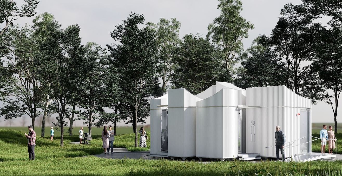 2.ประเภทผู้ออกแบบอิสระและประชาชนทั่วไป ได้แก่ ผลงาน “Good Heavens!” โดย โอ๊ก ศรนิล ที่มีแนวคิดว่าห้องน้ำสาธารณะมักถูกมองข้าม แม้เป็นพื้นที่ที่ทุกคนต้องใช้ร่วมกัน จึงเน้นออกแบบให้ใช้งานได้จริง โดยมีจุดเด่นตรงโครงสร้าง Modular Design ที่สามารถขยายเพิ่มได้ในอนาคต แต่ละห้องจะเป็นโมดูลสำเร็จรูปที่ผลิตจากโรงงานและนำมาติดตั้งได้ทันที หากห้องน้ำหญิงไม่เพียงพอก็สามารถเพิ่มโมดูลเข้าไปได้ และเลือกใช้พื้นผิวสแตนเลสที่ดูแลรักษาง่ายเพื่อลดคราบสกปรกและการสะสมของเชื้อรา พร้อมช่องระบายระหว่างพื้นและผนัง ลดความชื้นและช่วยให้ทำความสะอาดง่าย เนื่องจากคิดว่า Happy Toilet คือห้องน้ำที่สะอาดและตอบโจทย์การใช้งานจริง จะน้ำสะอาดหรือกระดาษชำระก็ควรมีให้พร้อม และห้องน้ำสาธารณะไม่ควรเป็นเพียงพื้นที่คลายทุกข์ แต่ต้องสร้างประสบการณ์ที่ดีให้เมือง จนผู้คนรู้สึกว่าน่าเข้าใช้ และช่วยยกระดับคุณภาพพื้นที่สาธารณะได้