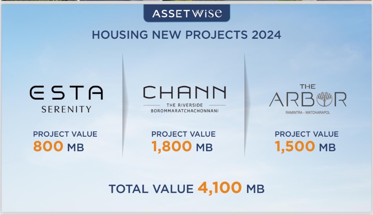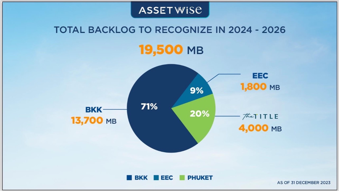 พร้อมกันนี้ แอสเซทไวส์ยังมีโครงการที่สร้างเสร็จใหม่พร้อมโอนในปี 2567 อีกจำนวน 9 โครงการ ซึ่งแบ่งเป็นคอนโดมิเนียม จำนวน 7 โครงการ มูลค่ารวมกว่า 9,557 ล้านบาท และโครงการแนวราบ 2 โครงการ และปัจจุบัน บริษัทฯมียอด Backlog อยู่ ถึง 19,500 ล้านบาท แบ่งเป็นสัดส่วนโครงการในกรุงเทพและปริมณฑล จำนวน 13,700 ล้านบาท โครงการในทำเล EEC จำนวน 1,800 ล้านบาท และโครงการในภูเก็ตอีกกว่า 4,000 ล้านบาท ซึ่งจะทยอยรับรู้รายได้ตั้งแต่ปี 2567 ต่อเนื่องไปถึงปี 2569