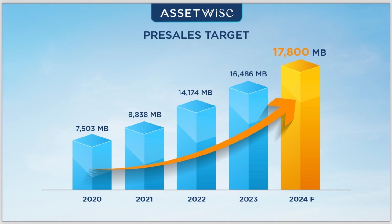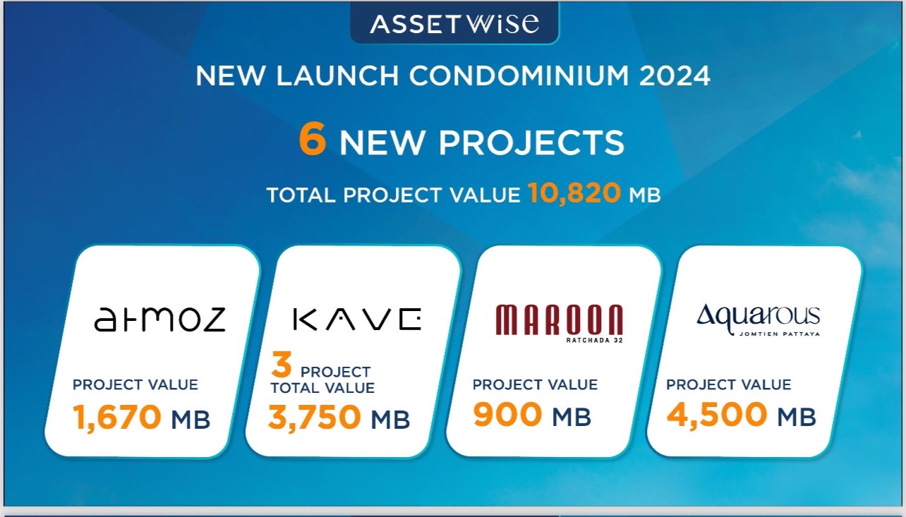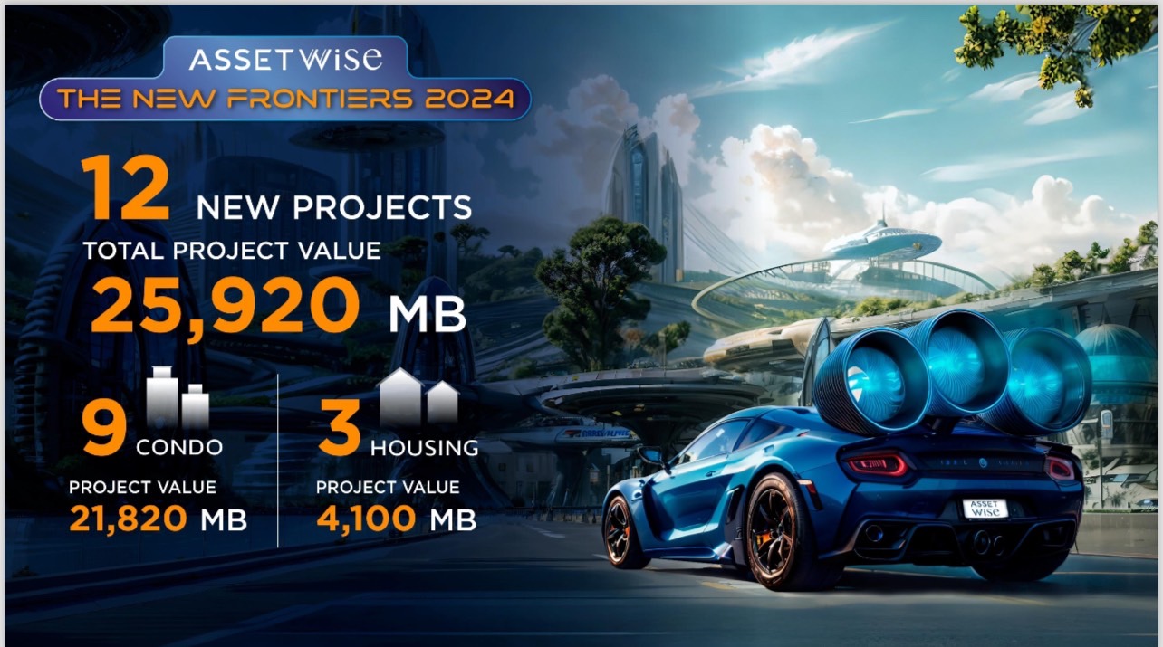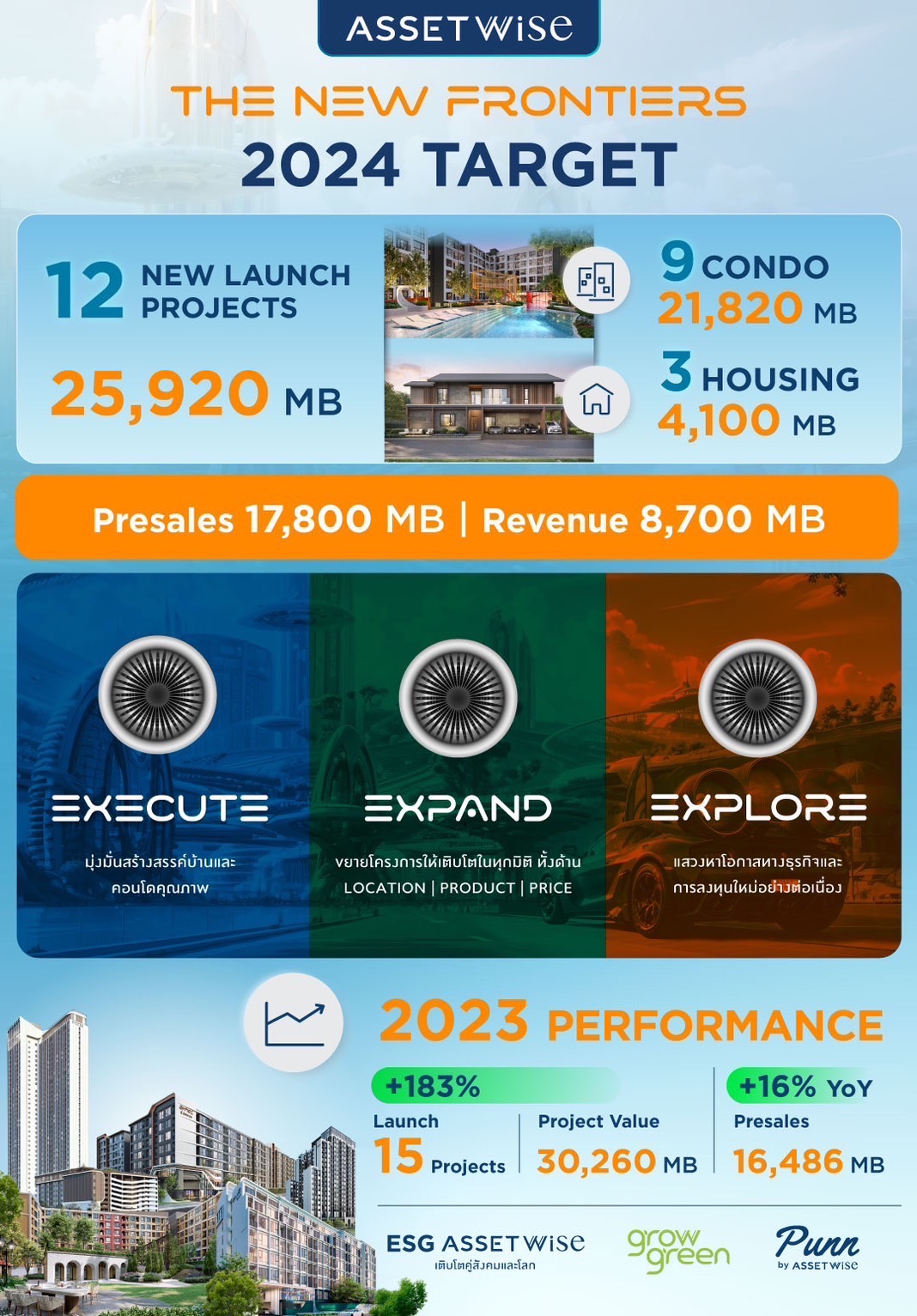 “สำหรับทิศทางอสังหาฯ ในปี 2567 นี้ ยังคงมีแนวโน้มการเติบโตในทิศทางเดียวกับ GDP ของประเทศ ซึ่งแนวโน้มภาพรวมในวันนี้ยังมีทั้งโอกาสและความเสี่ยง ปัจจัยบวกที่จะเข้ามาช่วยส่งเสริม และกระตุ้นกำลังซื้อในปีนี้ มีหลายปัจจัย เช่น การต่ออายุมาตรการลดค่าธรรมเนียม โอน – จดจำนอง ออกไปอีก 1 ปี รวมถึงมาตรการฟรีวีซ่าให้นักท่องเที่ยวชาวจีนที่จะเริ่มใช้วันที่ 1 มีนาคม 2567 นี้จะช่วยกระตุ้นให้นักท่องเที่ยวจีนเดินทางมาเที่ยวเมืองไทย ซึ่งคาดว่าจะทำให้เศรษฐกิจรวมถึงภาค อสังหาฯ กลับมาคึกคักอีกครั้ง อย่างไรก็ตาม แอสเซทไวส์ยังคงเดินหน้าอย่างเต็มกำลัง โดยปี 2567 ตั้งเป้าเปิดโครงการใหม่ 12 โครงการ มูลค่า 25,920 ล้านบาท แบ่งเป็น คอนโดมิเนียม 9 โครงการ และ แนวราบ 3 โครงการ พร้อมตั้งเป้าหมายยอดขายอยู่ที่ 17,800 ล้านบาท เติบโตประมาณ 8% จากปี 2566 และเป้าหมายรายได้อยู่ที่ 8,700 ล้านบาท ซึ่งจะขับเคลื่อนด้วยแนวคิด “THE NEW FRONTIERS” กับการพัฒนาแอสเซทไวส์ให้เติบโตอย่างยั่งยืนและมั่นคงในทุกมิติ โดยบูรณาการ 3 กลยุทธ์หลักซึ่งประกอบไปด้วย