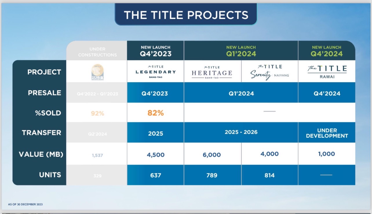 สำหรับพอร์ตอสังหาริมทรัพย์ที่ภูเก็ต ปัจจุบันแอสเซทไวส์พัฒนาคอนโดมิเนียมแบรนด์ THE TITLE ภายใต้บริษัท ร่มโพธิ์ พร็อพเพอร์ตี้ จำกัด (มหาชน) หรือ “TITLE” ในเครือแอสเซทไวส์ ซึ่งล่าสุดได้เปิดขายโครงการ เดอะ ไทเทิล เลเจนดารี บางเทา ในช่วงปลายปี 2566 ที่ผ่านมา ได้รับการตอบรับจากกลุ่มลูกค้าชาวไทยและชาวต่างชาติอย่างดีเยี่ยม จนตอนนี้มียอดขายรวมแล้วกว่า 80% สะท้อนให้เห็นถึงความเชื่อมั่นของลูกค้าที่มีต่อแบรนด์ THE TITLE และเพื่อต่อยอดความสำเร็จ ในปี 2567 บริษัทฯ มีแผนเปิดตัว 3 โครงการใหม่ ได้แก่ โครงการเดอะ ไทเทิล เฮอริเทจ บางเทา มูลค่าโครงการ 6,000 ล้านบาท โครงการเดอะ ไทเทิล เซเรนิตี้ ในยาง มูลค่าโครงการ 4,000 ล้านบาท และ โครงการเดอะ ไทเทิล ราไวย์ มูลค่าโครงการ 1,000 ล้านบาท นอกจากนี้ยังได้ร่วมลงทุนพัฒนาโครงการ โบทานิก้า แกรนด์ อเวนิว (BOTANICA Grand Avenue) ลักชัวรี่พูลวิลล่าที่เป็นเมกะโปรเจ็คต์ มูลค่าสูงถึง 13,000 ล้านบาท ในสัดส่วน 30% ทำให้พอร์ตอสังหาฯ ในภูเก็ตของแอสเซทไวส์มีความครบเครื่องมากยิ่งขึ้น มีโปรดักต์ครอบคลุมทั้ง Leisure คอนโดมิเนียม และวิลล่าระดับลักชัวรี