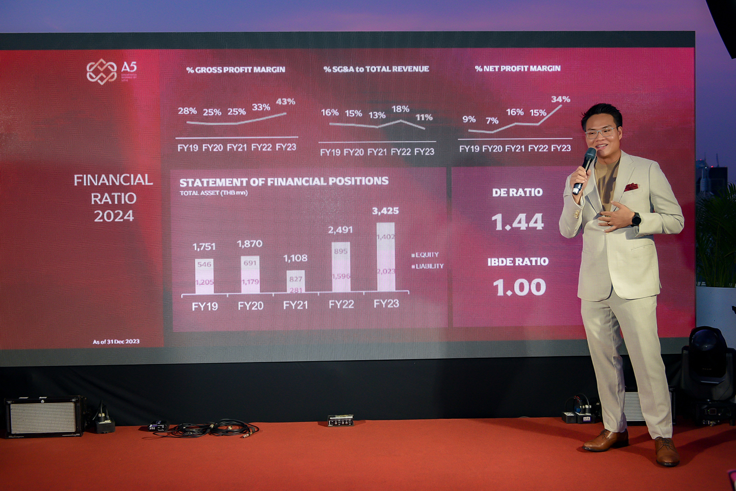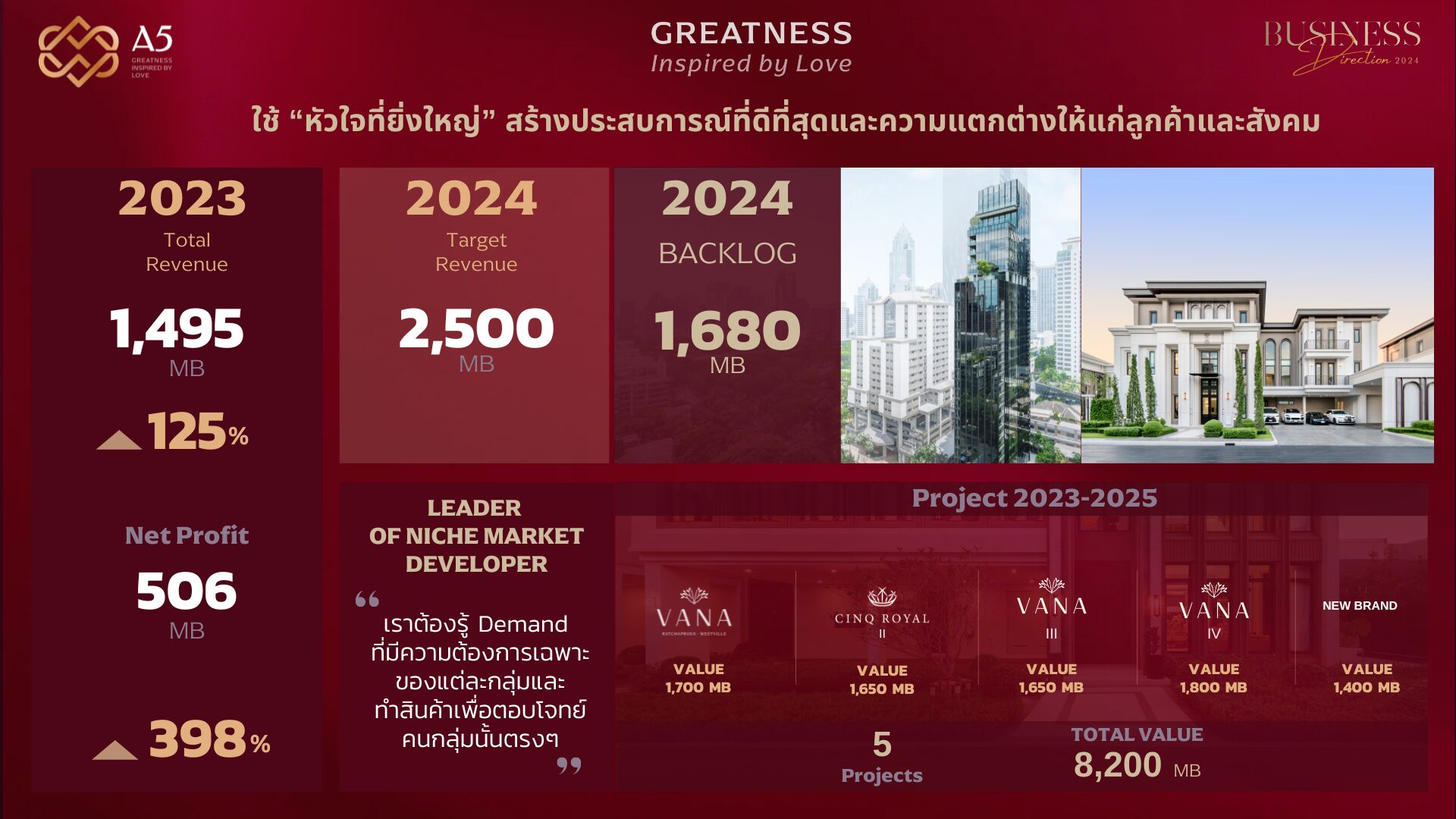 นาย ศุภโชค ปัญจทรัพย์ ประธานเจ้าหน้าที่บริหาร บริษัท แอสเซท ไฟว์ กรุ๊ป จำกัด (มหาชน) หรือ A5 เปิดเผยว่า หลังประสบความสำเร็จจากการพัฒนาโครงการระดับลักชัวรี ที่ได้รับการตอบรับอย่างดีจากลูกค้ามาโดยตลอด สะท้อนจากผลประกอบการที่เติบโตอย่างก้าวกระโดดในปี 2566 ซึ่งในปีนี้บริษัทยังคงมุ่งเน้นสร้างการเติบโตอย่างมีศักยภาพ ทั้งในส่วนของผลประกอบการ ฐานะทางการเงิน และการพัฒนาโครงการใหม่ เพื่อตอบโจทย์กลุ่มลูกค้าระดับบน