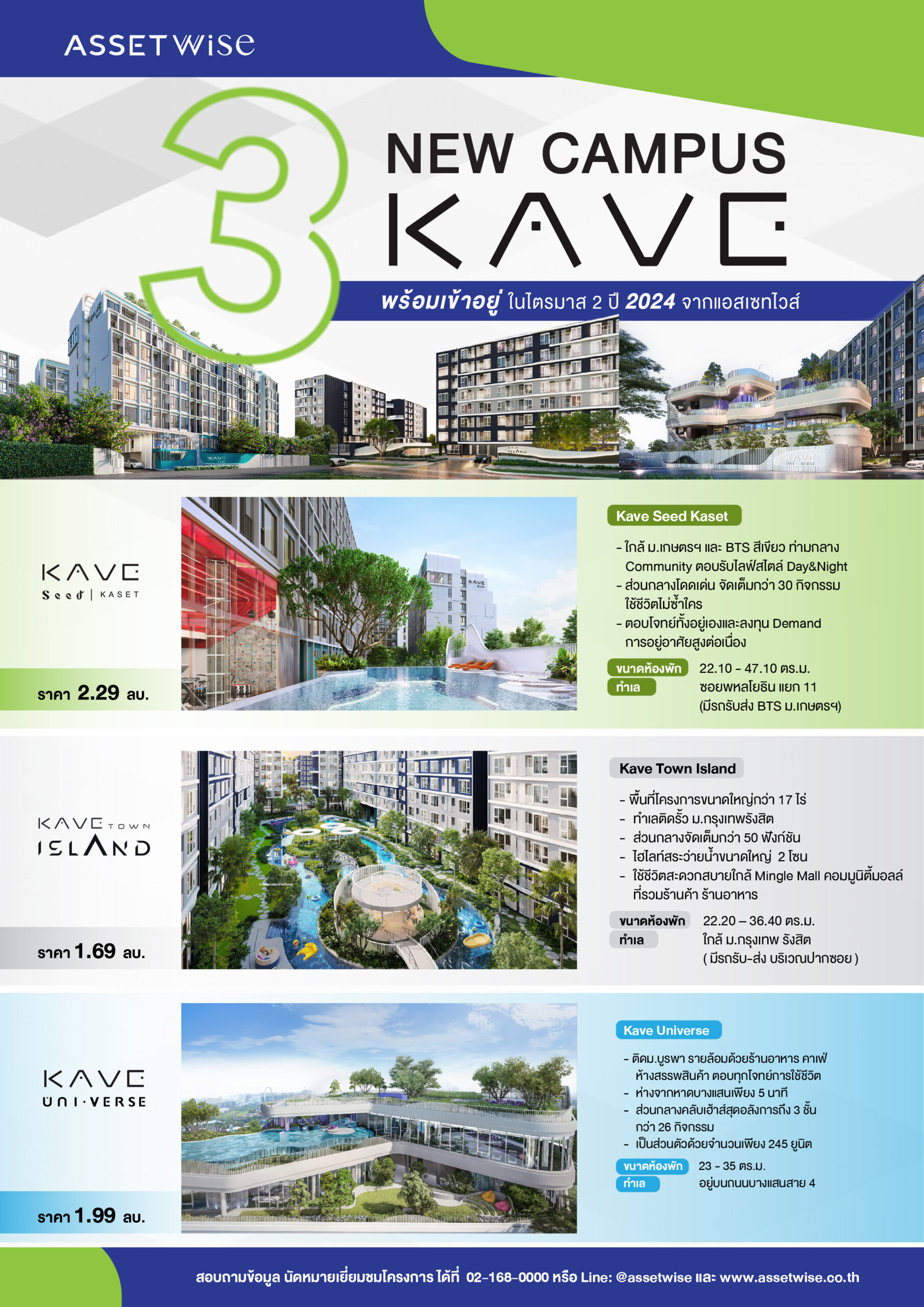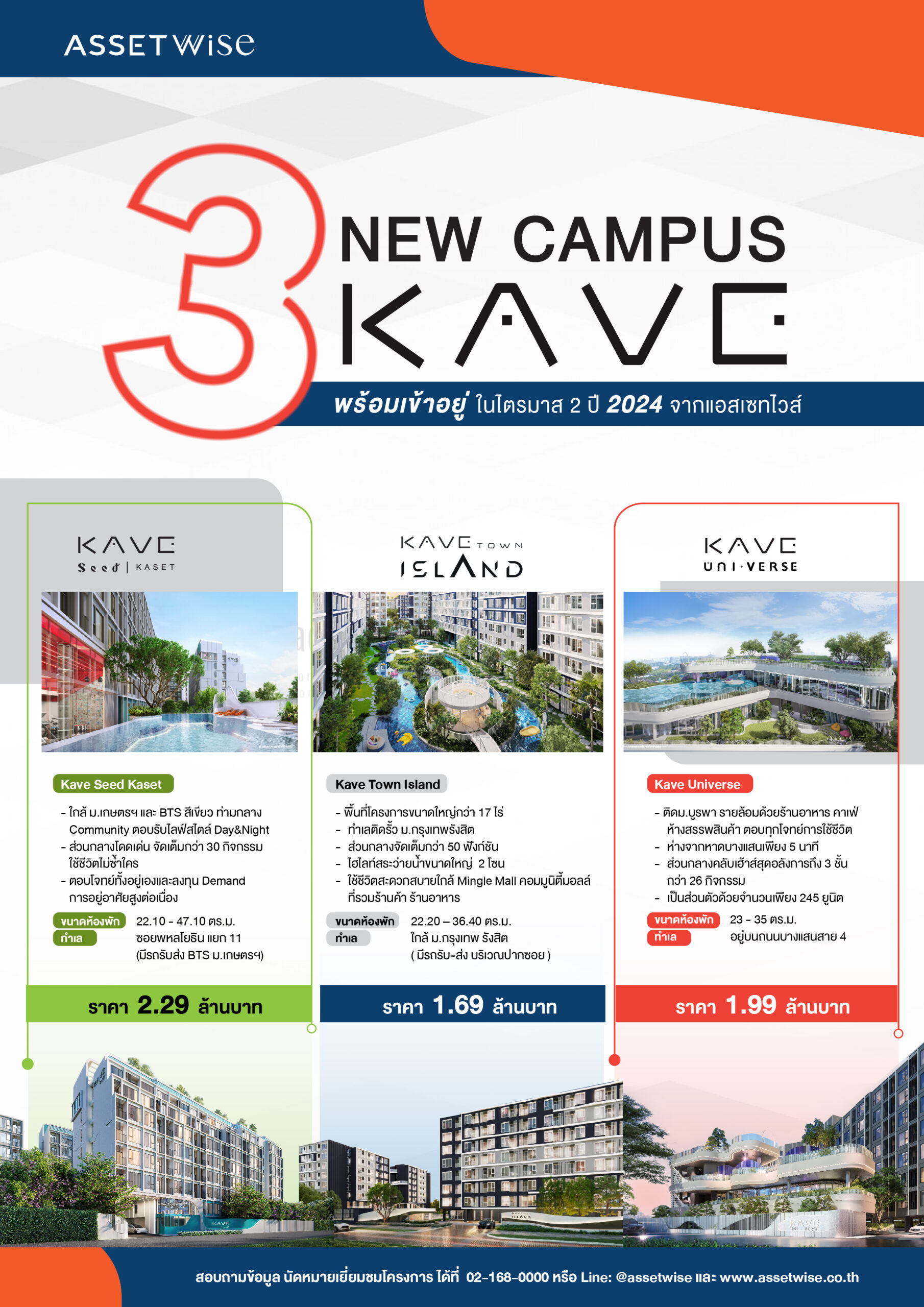 “แอสเซทไวส์” เตรียมอวดโฉมแบรนด์ KAVE แคมปัสคอนโดขวัญใจคนรุ่นใหม่ 3 โปรเจ็กต์ ที่สร้างเสร็จพร้อมอยู่พร้อมโอนกรรมสิทธิ์ในไตรมาส 2/2567 รวมมูลค่าโครงการ 5,070 ล้านบาท บนทำเลศักยภาพใกล้มหาวิทยาลัยทั้งในกรุงเทพฯ และ EEC กับ โครงการเคฟ ซี้ด เกษตร, โครงการเคฟ ทาวน์ ไอส์แลนด์ และโครงการเคฟ ยูนิเวิร์ส บางแสน ชู 3 จุดเด่นทั้งทำเล ส่วนกลางสุดอลัง และให้ผลตอบแทนสูง 8-10% หลังได้รับกระแสตอบรับที่ดี จากกลุ่มลูกค้าอยู่จริงและกลุ่มนักลงทุน พร้อมได้แรงหนุนจากมาตรการกระตุ้นอสังหาฯ มั่นใจช่วยดันยอดโอนคอนโดฯ ทั้งปีเป็นไปตามเป้า