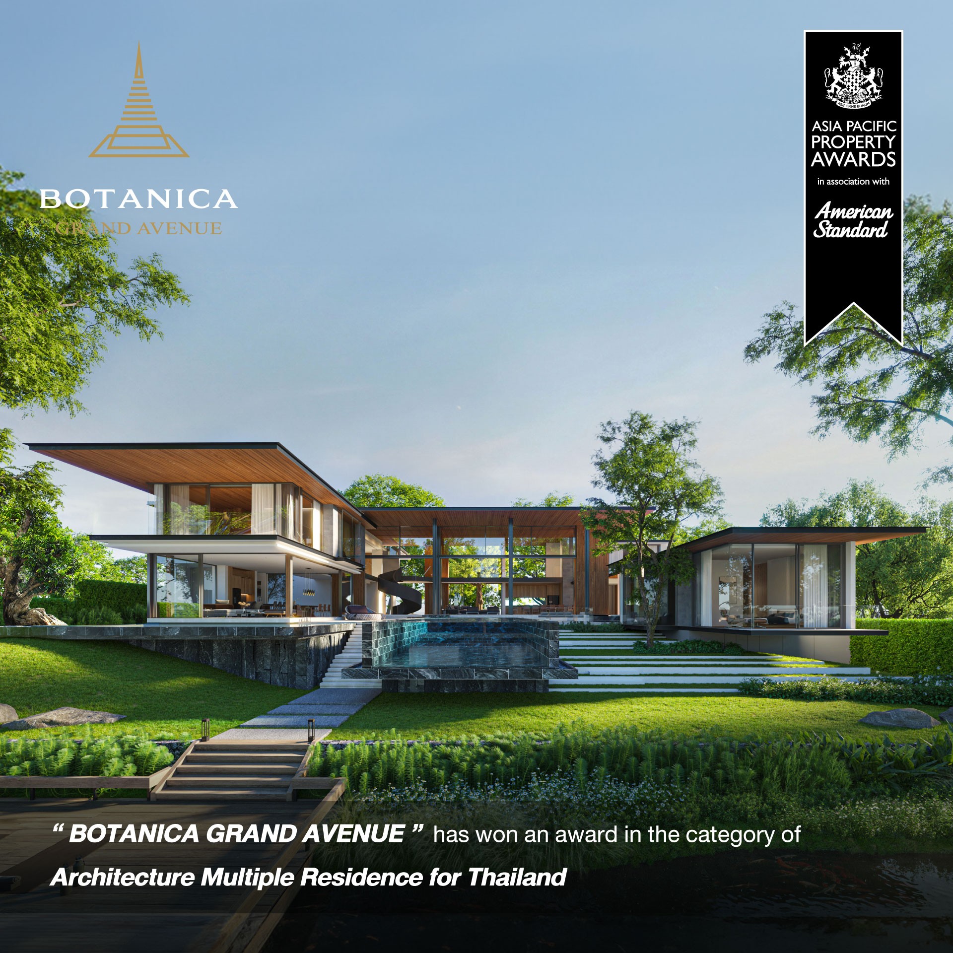 • โครงการ BOTANICA GRAND AVENUE ได้รับรางวัล “Architecture Multiple Residence for Thailand” เมกะโปรเจ็กต์แบบมิกซ์ยูสที่มีทั้งพูลวิลล่า คอนโดมิเนียม และคลับเฮาส์เหนือระดับแห่งนี้ เป็นอีกหนึ่งผลงานแห่งความภาคภูมิใจของทีมสถาปนิกและดีไซเนอร์ของโบทานิก้า ลักซูรี่ วิลล่า ที่ร่วมรังสรรค์ที่อยู่อาศัยเปี่ยมฟังก์ชันและคงไว้ซึ่งความเรียบหรูทันสมัยในแบบฉบับของแบรนด์