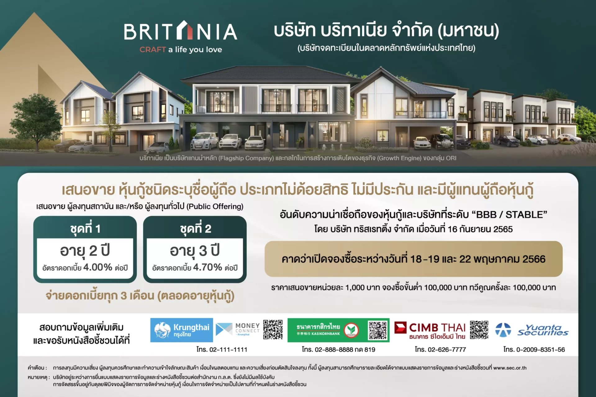 นายสุรินทร์ สหชาติโภคานันท์ ประธานเจ้าหน้าที่บริหาร บริษัท บริทาเนีย จำกัด (มหาชน) หรือ BRI ผู้นำในการพัฒนาอสังหาริมทรัพย์ ที่มุ่งมั่นพัฒนาที่อยู่อาศัยเพื่อสังคมที่ดีอย่างยั่งยืน เปิดเผยว่า ทางบริทาเนียเตรียมเสนอขายหุ้นกู้ชนิดระบุชื่อผู้ถือ ประเภทไม่ด้อยสิทธิ ไม่มีประกัน และมีผู้แทนผู้ถือหุ้นกู้ เสนอขายต่อผู้ลงทุนสถาบัน และผู้ลงทุนทั่วไป (Public Offering) โดยหุ้นกู้ที่ออกจำหน่ายครั้งนี้แบ่งเป็น 2 ชุด ประกอบด้วย หุ้นกู้ชุดที่ 1 อายุ 2 ปี ครบกำหนดไถ่ถอนปี 2568 อัตราดอกเบี้ยคงที่ 4.00% ต่อปี และหุ้นกู้ชุดที่ 2 อายุ 3 ปี ครบกำหนดไถ่ถอนปี 2569 อัตราดอกเบี้ยคงที่ 4.70% ต่อปี กำหนดจ่ายดอกเบี้ยในอัตราคงที่ทุกๆ 3 เดือนตลอดอายุหุ้นกู้ ราคาเสนอขายหน่วยละ 1,000 บาท จองซื้อขั้นต่ำ 100,000 บาท และทวีคูณครั้งละ 100,000 บาท