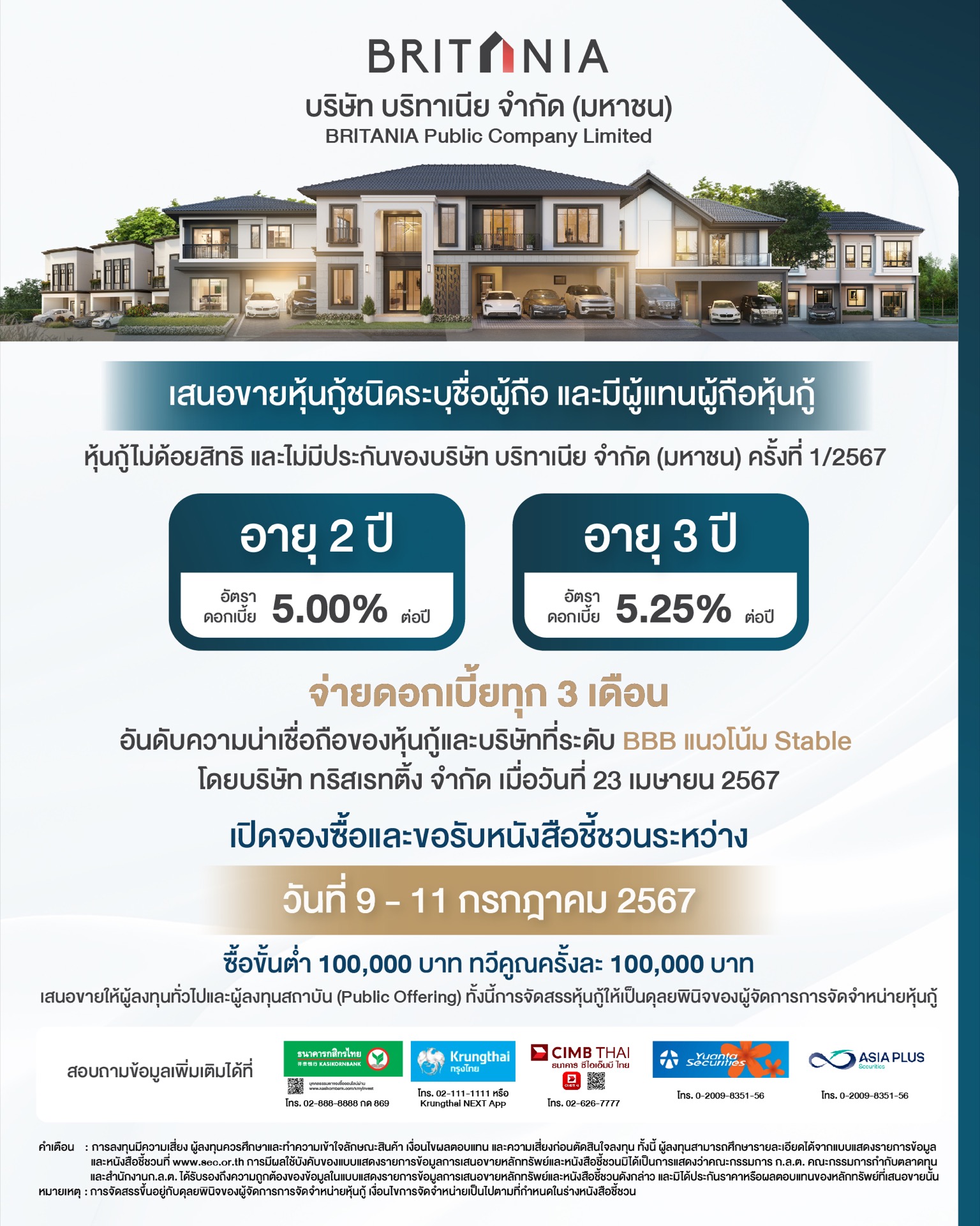นายธีรเดช เกิดสำอางค์ ประธานเจ้าหน้าที่บริหาร บริษัท บริทาเนีย จำกัด (มหาชน) หรือ BRI ผู้นำในการพัฒนาอสังหาริมทรัพย์ ที่มุ่งมั่นพัฒนาที่อยู่อาศัยเพื่อสังคมที่ดีอย่างยั่งยืน เปิดเผยว่า บริษัทเตรียมเสนอขายหุ้นกู้ครั้งที่ 1/2567 เป็นหุ้นกู้ชนิดระบุชื่อผู้ถือ ประเภทไม่ด้อยสิทธิ ไม่มีประกัน และมีผู้แทนผู้ถือหุ้นกู้ ต่อผู้ลงทุนสถาบัน และ ผู้ลงทุนทั่วไป (Public Offering) โดยหุ้นกู้ที่ออกจำหน่ายมีจำนวน 2 รุ่น ได้แก่ หุ้นกู้ชุดที่ 1 อายุ 2 ปี อัตราดอกเบี้ย 5.00% ต่อปี และหุ้นกู้ชุดที่ 2 อายุ 3 ปี อัตราดอกเบี้ย 5.25% ต่อปี จ่ายดอกเบี้ยทุก 3 เดือนตลอดอายุหุ้นกู้ ราคาเสนอขายหน่วยละ 1,000 บาท จองซื้อขั้นต่ำ 100,000 บาท และทวีคูณครั้งละ 100,000 บาท