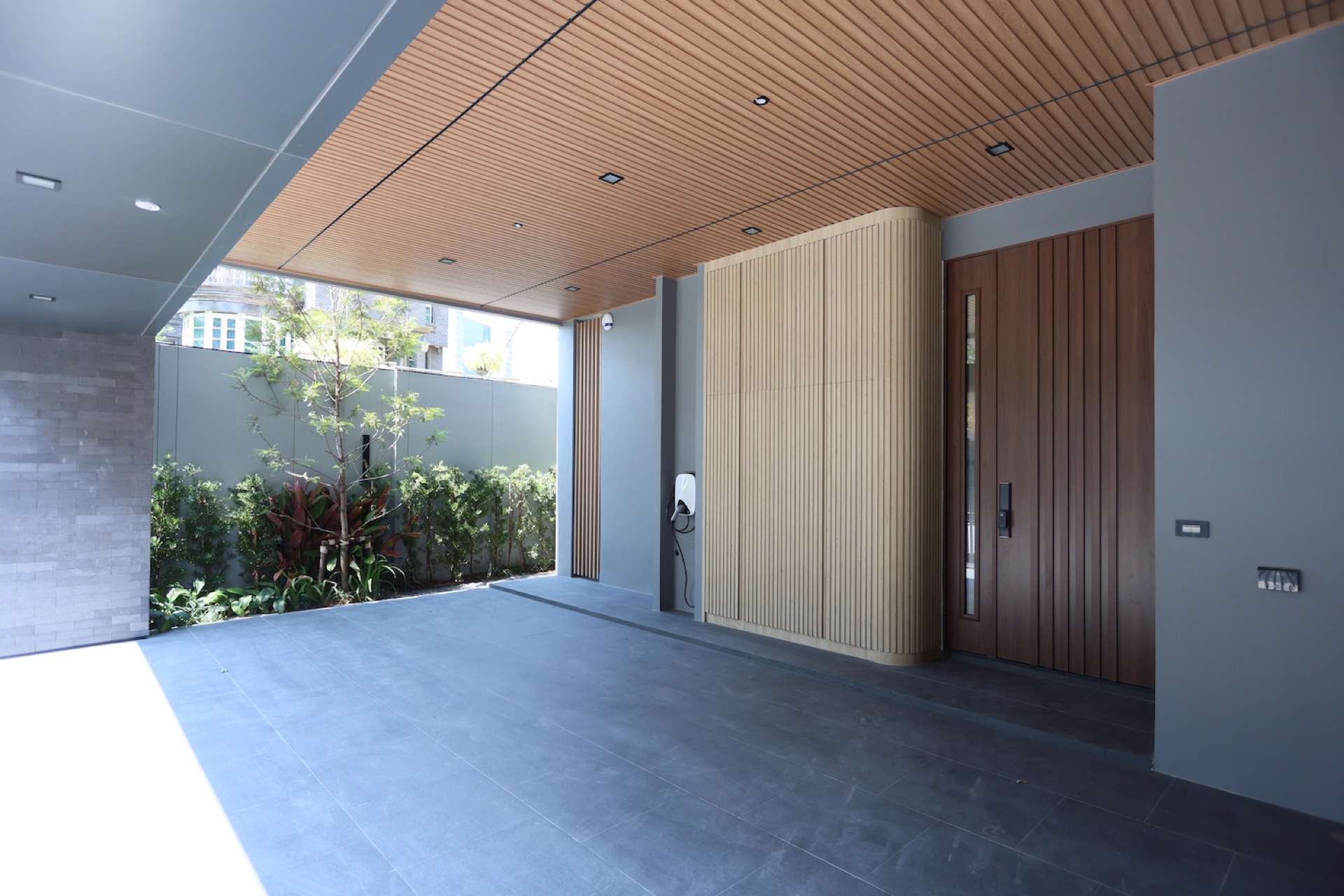 เมื่อเดินเข้ามาภายในบริเวณบ้าน จะพบกับความโล่งโปร่งสบายด้วยเพดานที่สูง 3.2 เมตร และประตูกระจกเทมเปอร์ (Tempered Glass) ซึ่งเป็นกระจกนิรภัยบานใหญ่ที่ปลอดภัยกว่ากระจกทั่วไปถึง 4-5 เท่า เพื่อป้องกันแสงและความร้อน ด้วยความหนาเป็นพิเศษถึง 6 มม. พร้อมเชื่อมต่อให้ผู้อยู่อาศัยได้สัมผัสถึงธรรมชาติสีเขียวรอบบ้านที่โอบกอดเราไว้