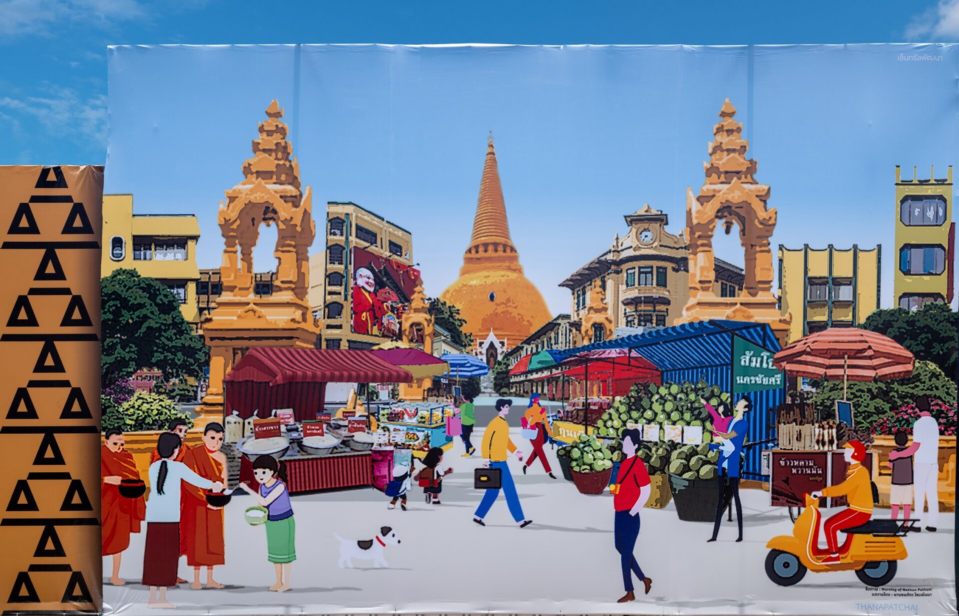 ∙ Morning of Nakhon Pathom : สะท้อนภาพวิถีชีวิตผ่านตลาดยามเช้าหน้าสถานีรถไฟจังหวัดนครปฐม ที่มีกลิ่นอายความเป็นอัตลักษณ์ของท้องถิ่น ดั่งเช่นคำขวัญประจำจังหวัด ส้มโอหวาน ข้าวสารขาว ข้าวหลามหวานมัน พระปฐมเจดีย์สียดฟ้า ฯลฯ ที่อยู่ควบคู่ไปกับบริบททางสังคมปัจจุบัน สื่อสารผ่าน Digital Art สีสดใสที่แสดงถึงความเป็นอิสระในทุกด้านอย่างไม่มีข้อจำกัด ความเท่าเทียมซึ่งกันและกัน ทั้งเพศ สีผิว ชนชาติ หรือเชื้อชาติ เป็นสีที่พร้อมปลดปล่อยความสดใสหลังจากเจอวิกฤตต่างๆ โดยนาย ธนภัทร ไชยพันนา ภาควิชา : ศิลปไทย คณะจิตรกรรม ประติมากรรมและภาพพิมพ์ มหาวิทยาลัยศิลปากร