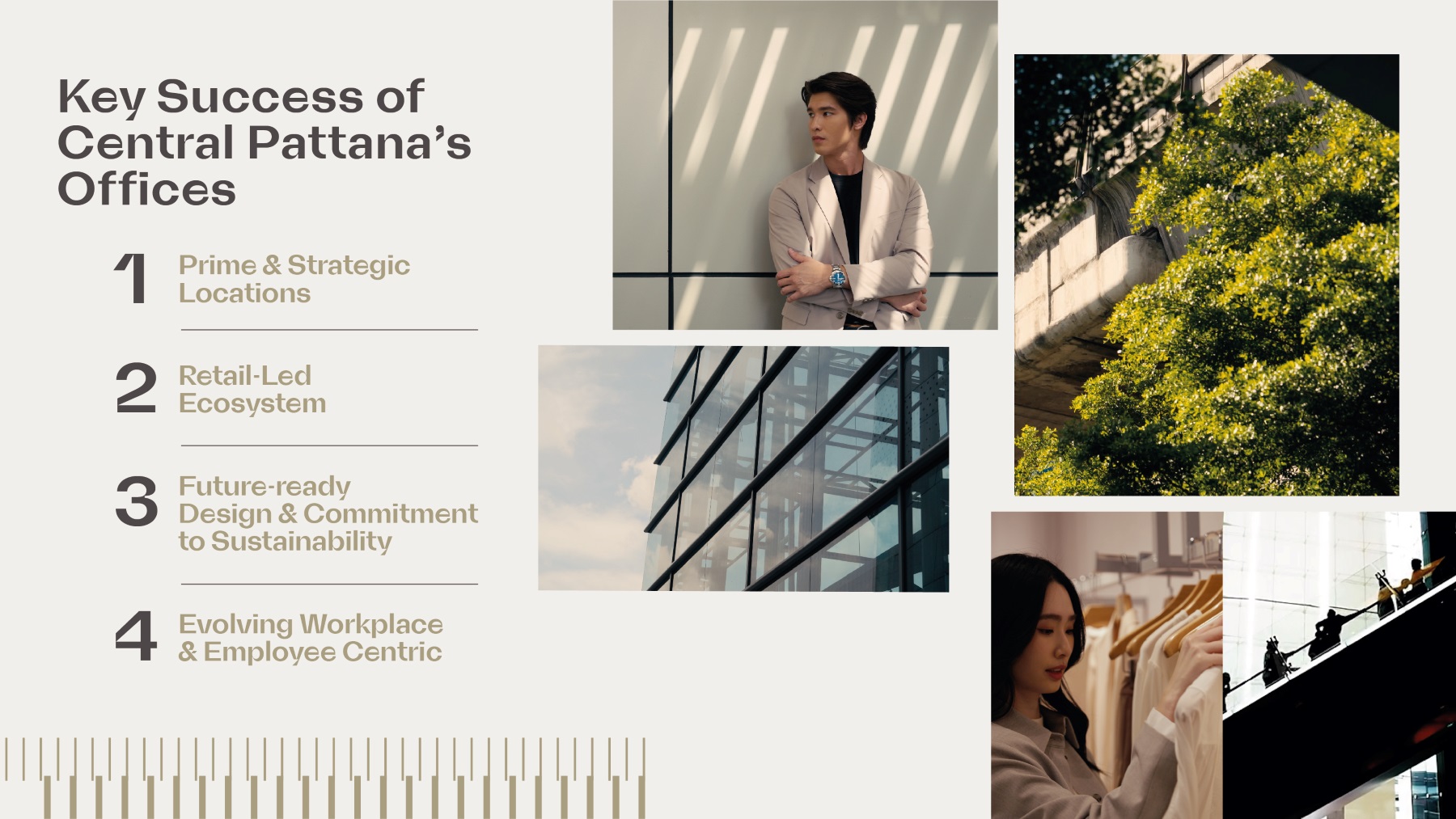 • เซ็นทรัลพัฒนาตั้งเป้าธุรกิจออฟฟิศ เติบโตต่อเนื่องมากกว่า 10% ต่อปี ภายในระยะเวลา 5 ปีต่อจากนี้ ด้วยจุดแข็งพัฒนาออฟฟิศบนทำเลทองติดศูนย์การค้าตอบโจทย์ครบทุกมิติ และสร้างมูลค่าเพิ่มจากออฟฟิศปัจจุบัน พร้อมด้วยมาตรฐานความยั่งยืนระดับโลก การันตีด้วยอันดับ 1 DJSI World 2023 ในกลุ่มอสังหาฯ