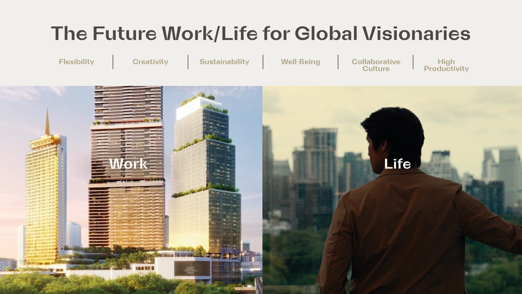 • Here for the Global Visionaries เหนือกว่าด้วย 3 แนวคิด 1) Perfect Work/Life Harmony ใช้ชีวิตและทำงานในโครงการมิกซ์ยูสที่เชื่อมต่ออย่างลงตัว อยู่ติดสวนขนาดใหญ่ภายในโครงการ; 2) Convenience Connectivity เดินทางสะดวกกับจุดเชื่อมต่อ BTS & MRT โดยพื้นที่โครงการมีขนาดเหมาะสมด้วย Walkable Proximity; และ 3) Forward-Thinking Crowd คอมมูนิตี้คนทำงานที่มีวิสัยทัศน์จากบริษัทชั้นนำทั้งในไทยและทั่วโลก