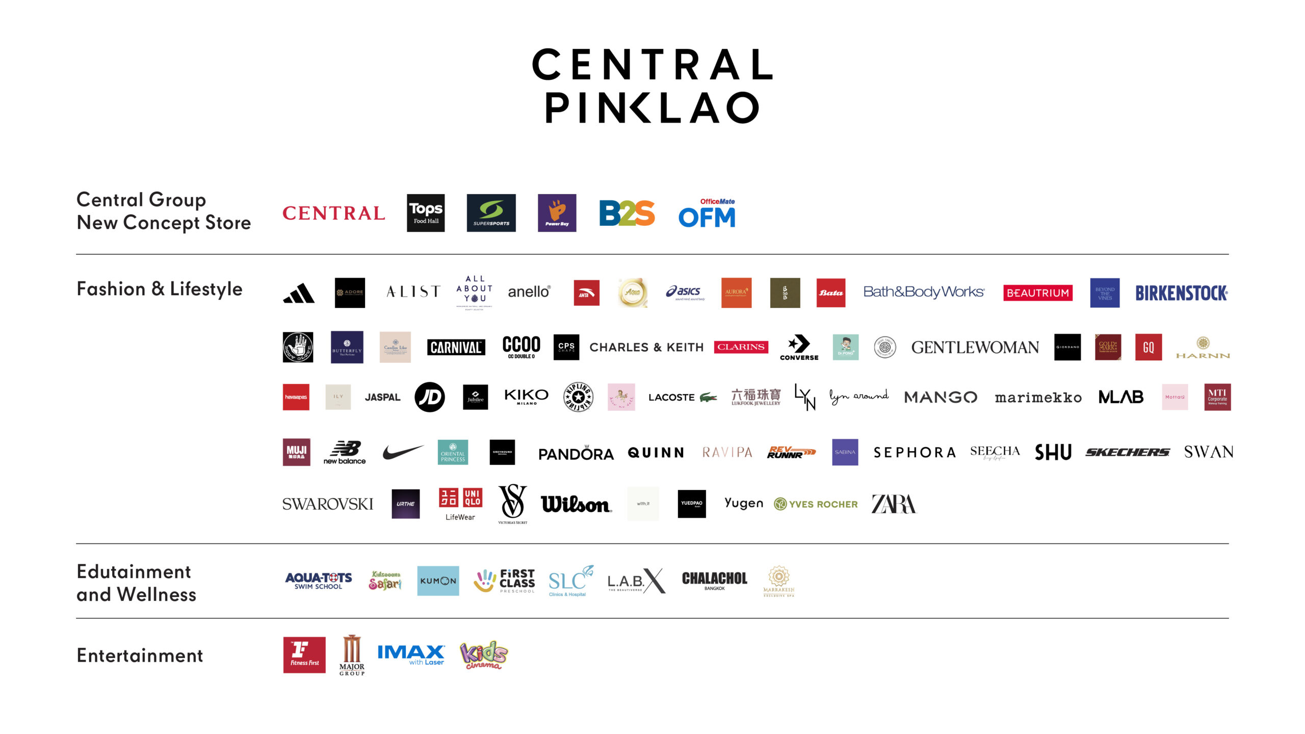 • แบรนด์แฟชั่นและไลฟ์สไตล์ชั้นนำ อาทิ Adidas, Anta, Bath & Body Works, Beyond the Vines, Birkenstock, Carnival, Calvin Klein, CHARLES & KEITH, GENTLEWOMAN, JD Sports, Mango, Marrimekko, MUJI, MLAB, New Balance, Nike, Pandora, Rituals, Sephora, Skechers, SWAROVSKI, Wilson, Victoria’s secret, Uniqlo, Zara เป็นต้น