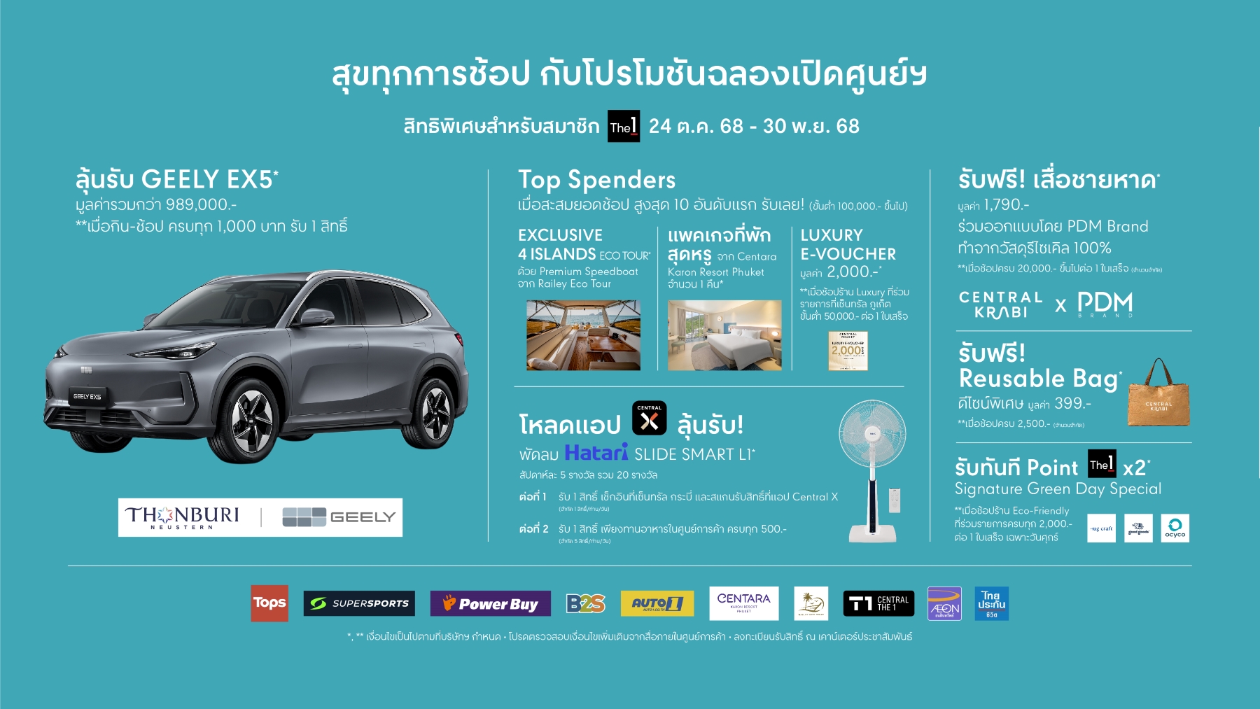 • ห้ามพลาด! โปรโมชั่นไฮไลต์ฉลองเปิดเซ็นทรัล กระบี่ รวมของรางวัล Eco สอดคล้องกับ ศูนย์การค้าและเมือง รวมมูลค่ากว่า 3 ล้านบาท ช้อปครบทุก 1,000.- รับสิทธิ์ลุ้นรถยนต์พลังงานไฟฟ้า GEELY EX5 1 รางวัล มูลค่า 989,000 บาท*, ช้อปครบ 2,500.- รับ กระเป๋า Reusable Bag มูลค่า 399 บาท* ช้อปครบ 20,000.- รับฟรี เสื่อชายหาด ดีไซน์พิเศษจากแบรนด์ PDM ที่ใช้วัสดุ Recycle 100% มูลค่า 1,790 บาท*, ช้อปร้าน Eco Friendly & Local Craft ที่ร่วมรายการ ครบ 2,000.- (เฉพาะวันศุกร์) รับคะแนน The1 x2*, โหลดแอป Central X ลุ้นรับพัดลม Hatari Slide Smart L1 สัปดาห์ละ 5 รางวัล รวม 20 รางวัล*, Top Spender (10 รางวัล): สะสมยอด 100,000.- ขึ้นไป รับเลย Exclusive Eco Tour 4 เกาะ ด้วย Premium Speedboat จำนวน 1 วัน จาก Railey Eco Tour พร้อมที่พักสุดหรูจาก Centara Karon Resort Phuket จำนวน 2 วัน 1 คืนและ รับ Luxury Voucher 2,000 บาท เมื่อช้อปร้านลักชัวรีที่ร่วมรายการที่เซ็นทรัล ภูเก็ต ขั้นต่ำ 50,000.-/ใบเสร็จ*