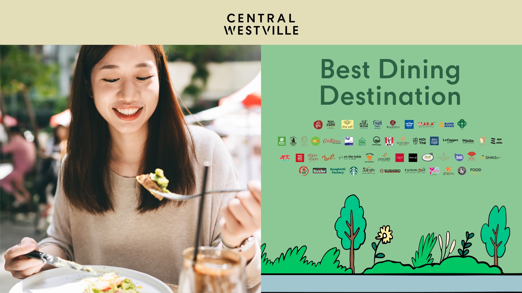 • Best Dining Destination ดีที่สุดในย่าน รวมกว่า 80 แบรนด์ แบบ All-Day Dining อาทิ ร้านดังเครือไอเบอรี่: ทองสมิทธิ์, รส’นิยม, โรงสีโภชนา, อันเกิม-อันก๋า, ปรายระย้า ซิกเนเจอร์, ลิ้ม เหล่า โหง่ว, Nana Coffee Roaster ร้านกาแฟสเปเชียลตี้ที่เปิดตั้งแต่ 7 โมงเช้า, Cath Kidston Tearoom, Mil Toast House, Nam Nam Pasta and Tapas, Yakiniku Like, Nice Two Meat U, Saemaeul (แซมาอึล) เป็นต้น