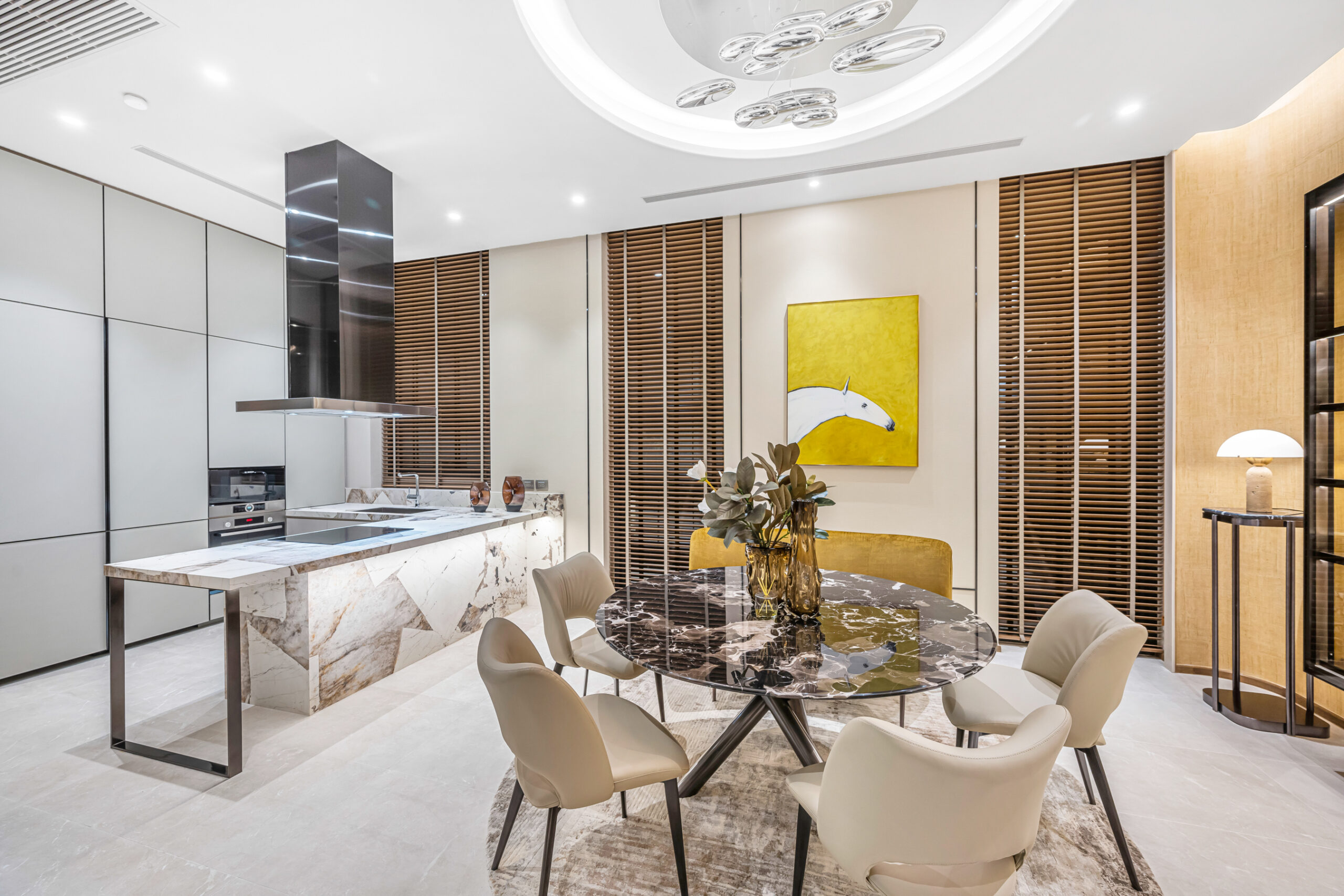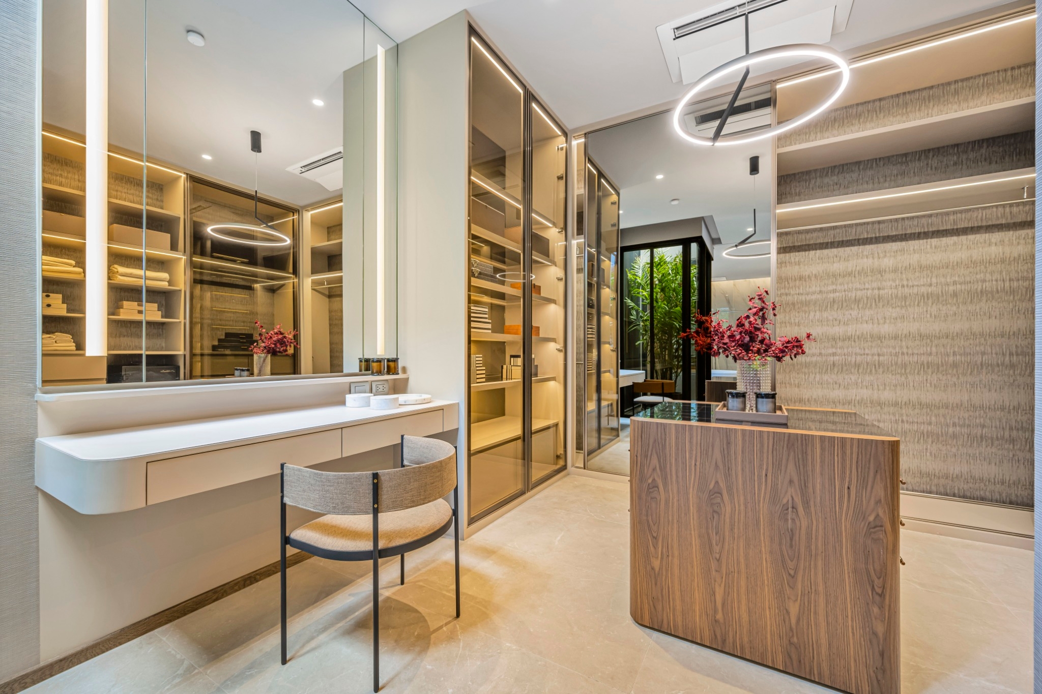 โดยบริเวณชั้น 1 มีการออกแบบ Foyer ให้มีความต่อเนื่อง Living Garage และ Foyer ยังเป็นจุดเชื่อมของบ้านจาก Main Living & Dining Room กับ Family Dining ที่มาพร้อมกับ Euro Kitchen และต่อไปยังครัวไทย ที่เชื่อมโยงถึงกัน แบ่งเป็นโซนพักผ่อน จัดเลี้ยงปาร์ตี้ในกลุ่มญาติสนิท รวมไปถึงเพื่อนฝูงที่แวะเวียนมา ได้สัมผัสกับบ้านที่เป็นนอกเหนือจากที่อยู่อาศัยแห่งนี้ ได้สัมผัสถึงบรรยากาศของบ้านที่นอกจากจะมีความอบอุ่นแล้ว ยังให้อารมณ์ความรู้สึกตื่นเต้น คึกคัก มีความทันสมัย เรียบง่าย และโก้หรู มีการใช้วัสดุ ผสมผสาน หลากหลาย อบอุ่นด้วยการนำพื้นทางเดินที่เป็น Walnut Veneer สลับกับ White Marble ที่คัดลายเป็นพิเศษ แบบ Natural Glam ตัดกับเส้นลายที่คม เฉียบ ของ Black Chrome Metal อีกทั้งในโซนต่างๆ ยังผสมผสานการใช้หนังในการตกแต่งที่สะท้อนถึง Craftsmanship ของ Art Brand ต่างๆ