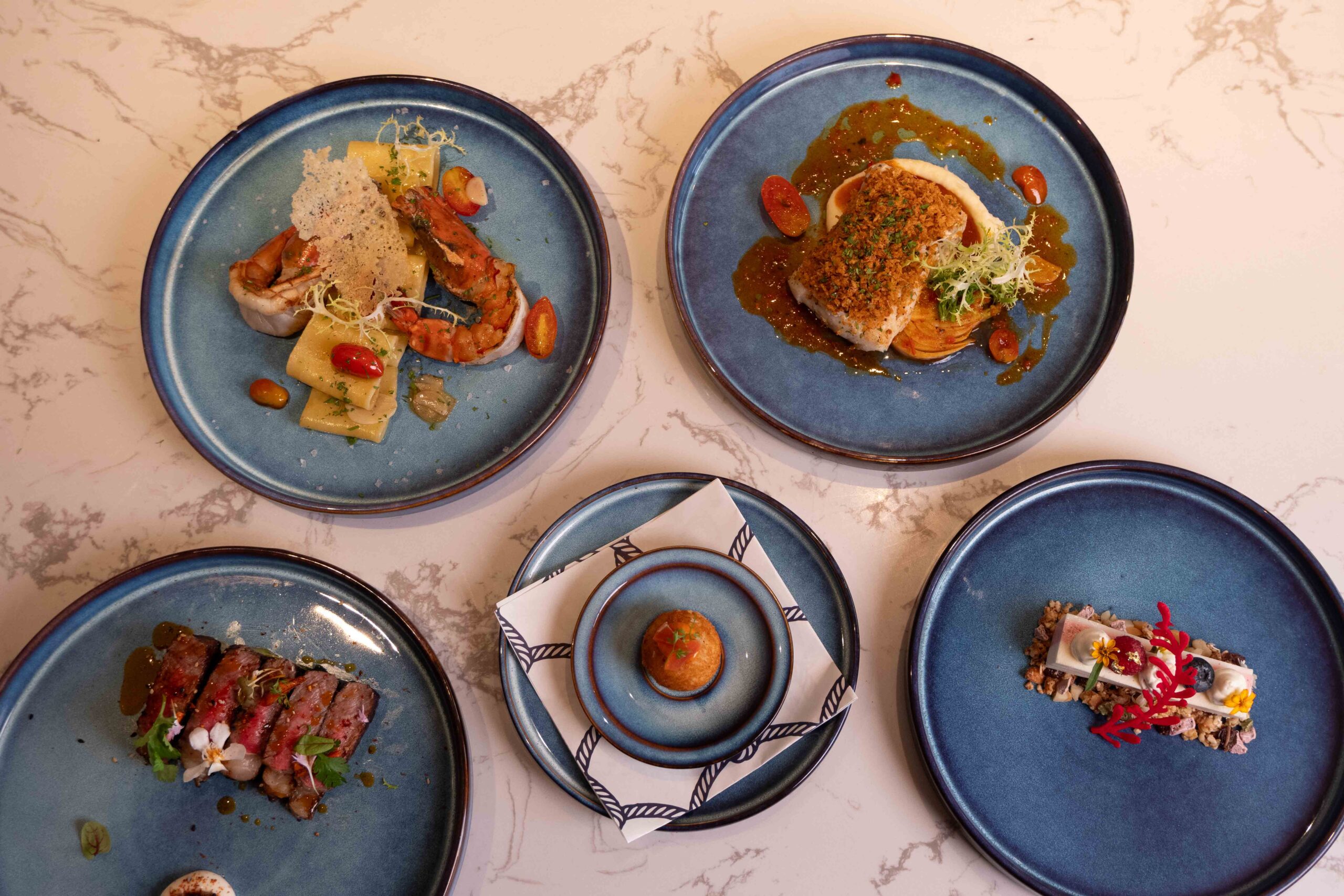 เริ่มต้นมื้ออาหารด้วยเครื่องดื่มพร้อมกับของว่างเป็น ชีสทอดกับเกล็ดขนมปังและเปลือกแตงโมแช่อิ่ม และข้าวตังหน้าแกงรวมมิตร ก่อนจะเสิร์ฟเมนูมื้อค่ำทั้ง 8 คอร์ส ที่ประกอบด้วย Amuse Bouche เพื่อเปิดต่อมรับรสและเพิ่มความสนุกก่อนมื้ออาหาร: ขนมปังฝรั่งเศสชาร์โคลผักกับครีมต้นหอมและเห็ด ต่อด้วยอาหารเรียกน้ำย่อย 2 รายการ ได้แก่ หมูกรอบสไตล์เม็กซิกันกับพริกย่าง เป็นเมนูอาหารว่างแบบเย็น และกุ้งโสร่งกับพล่ากุ้งสดและซอสมะม่วงในแบบร้อน ตามด้วยอาหารจานหลัก เป็น ปลากะพงแดงอบกับเกล็ดขนมปัง ผักเฟลเนลและซอสเลมอน และวนิลลากับชาและขิงไอศครีมซอฟต์เสิร์ฟสไตล์อิตาลีและเบอร์รี่ เนื้อวากิวพิคานย่ากับผักชีและผักบ็อคชอยซอสมันเนื้อ และชีสเค้กโยเกิร์ตมะม่วง ทาร์ตมะพร้าวและช็อคโกแลต เป็นขนมหวานปิดท้าย